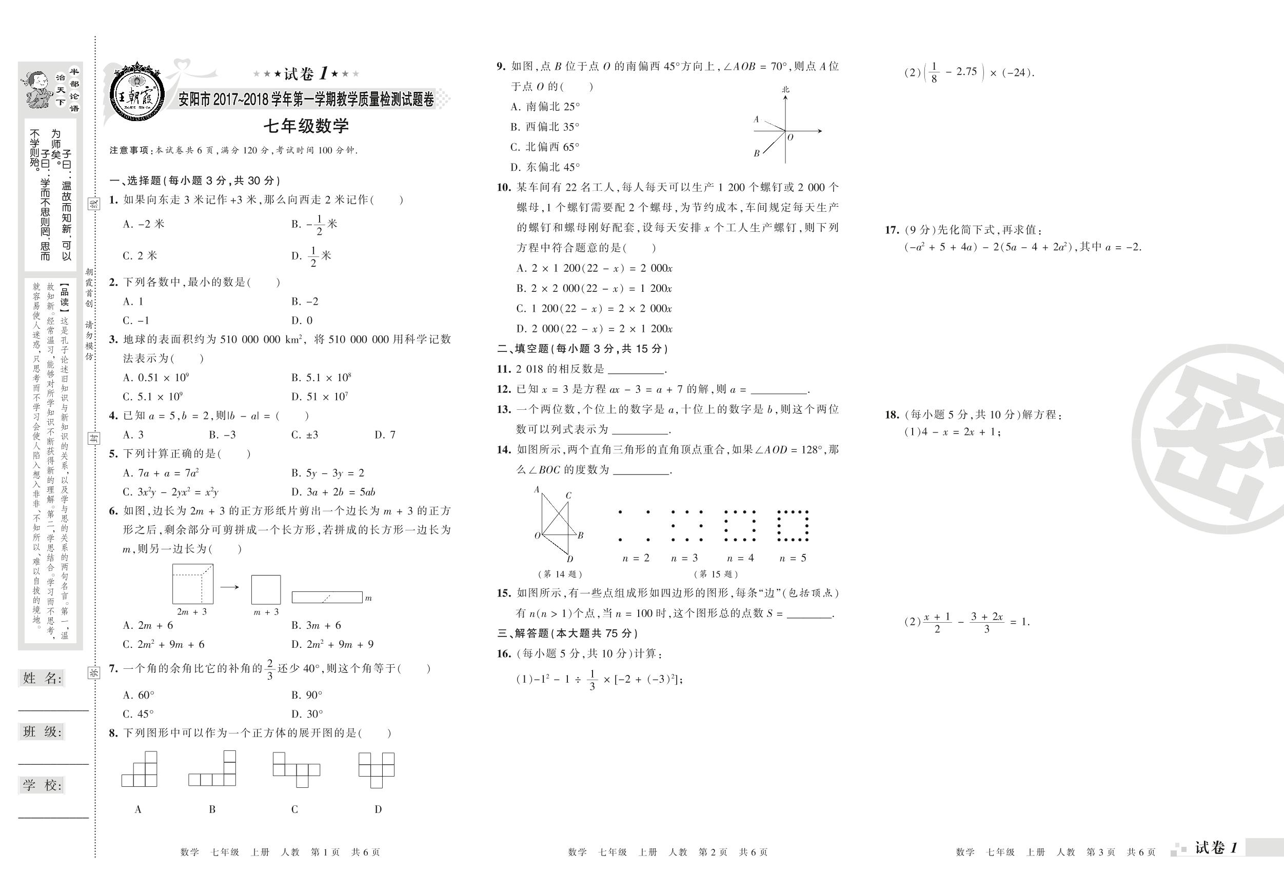 2017-2018学年第一学期安阳市七年级数学试卷(人教版)【1】