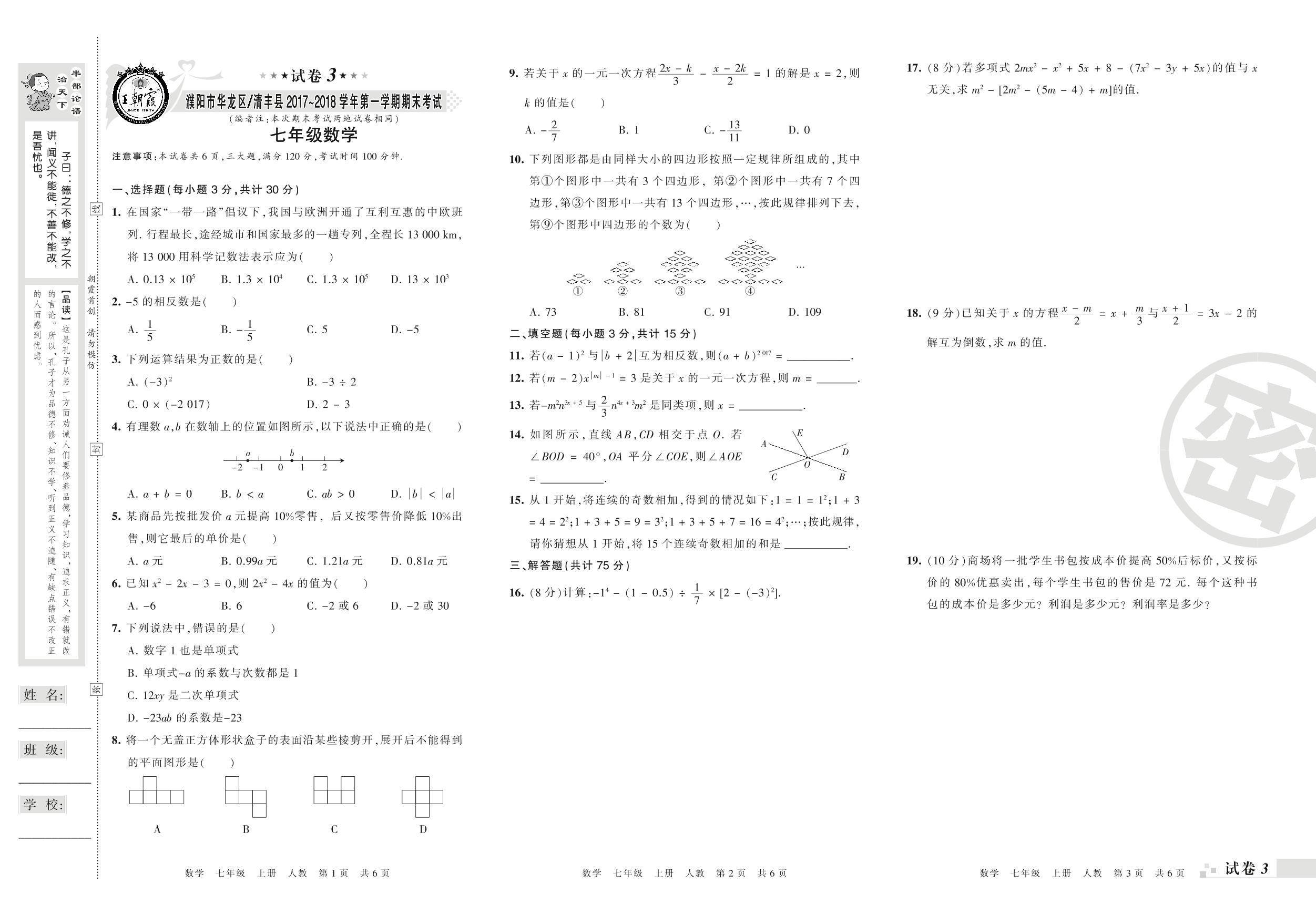 2017-2018学年第一学期濮阳市华龙区、清丰县七年级数学试卷(人教版)【3】