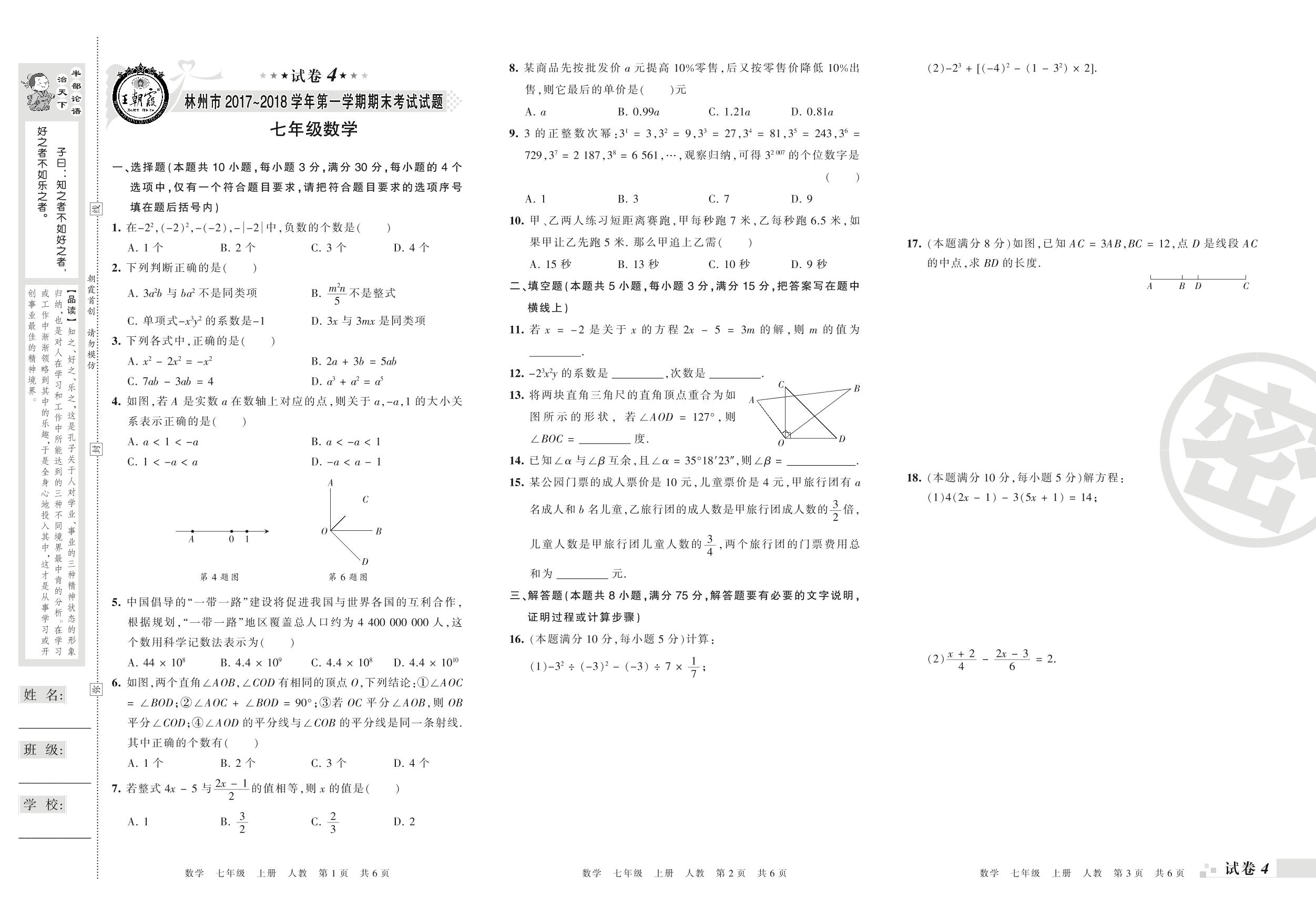 2017-2018学年第一学期林州市七年级数学试卷(人教版)【4】