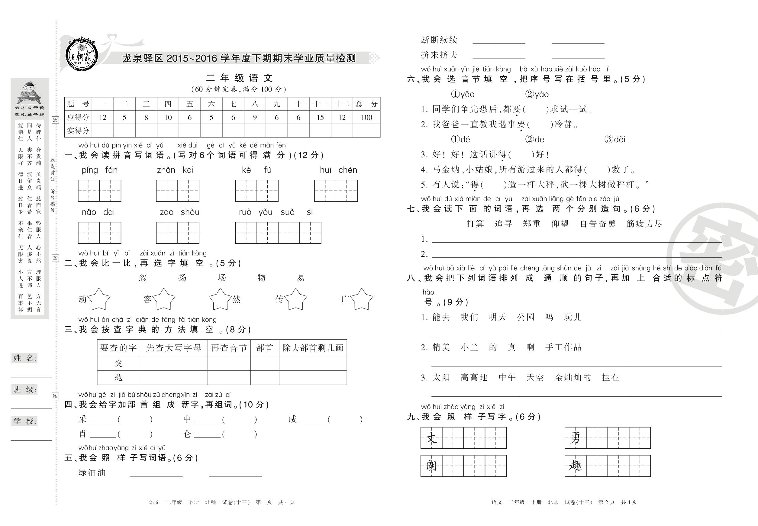 2015-2016学年第二学期成都市龙泉驿区二年级语文试卷(北师版)【13】