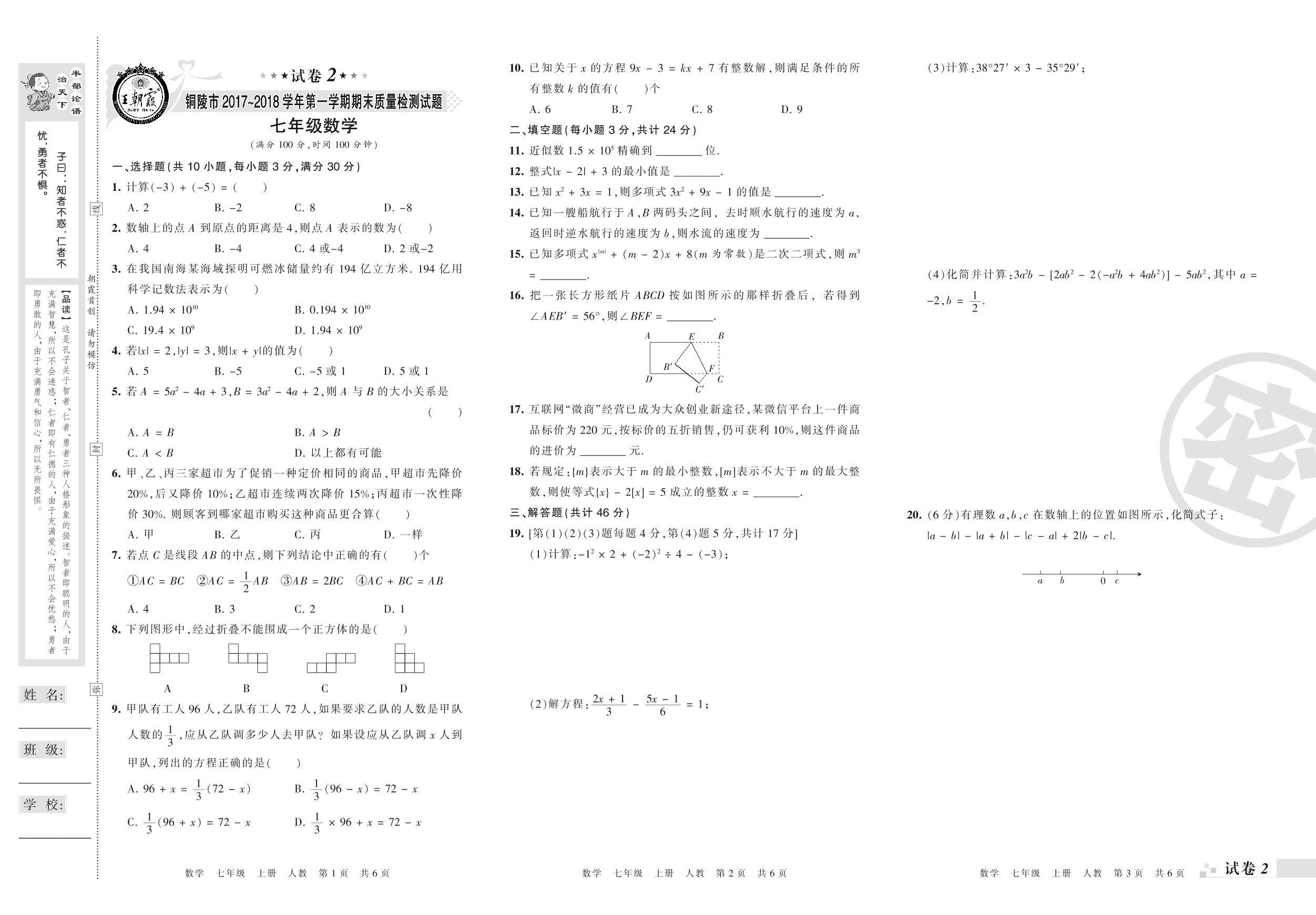 2017-2018学年第一学期铜陵市七年级数学试卷(人教版)【2】