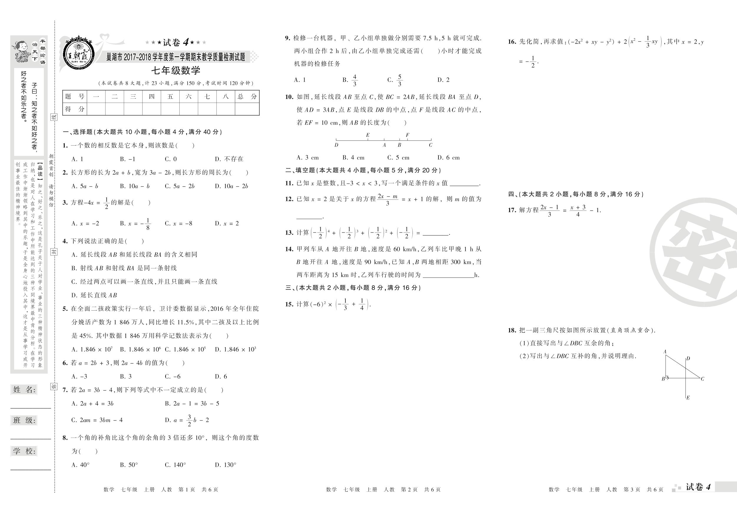 2017-2018学年第一学期巢湖市七年级数学试卷(人教版)【4】