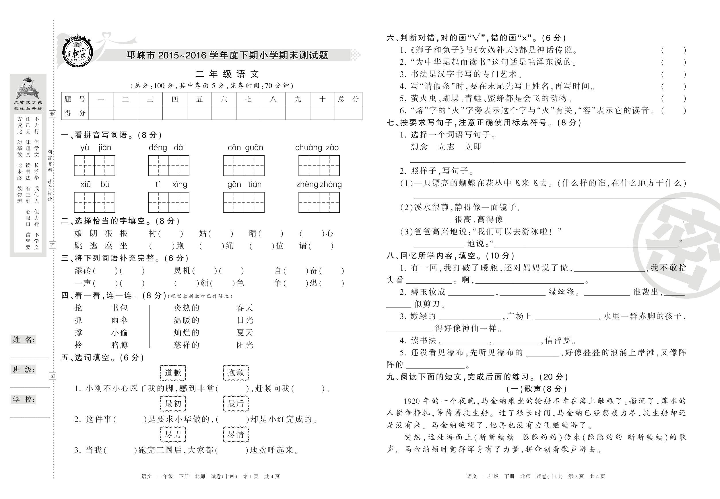 2015-2016学年第二学期邛崃市二年级语文试卷(北师版)【14】