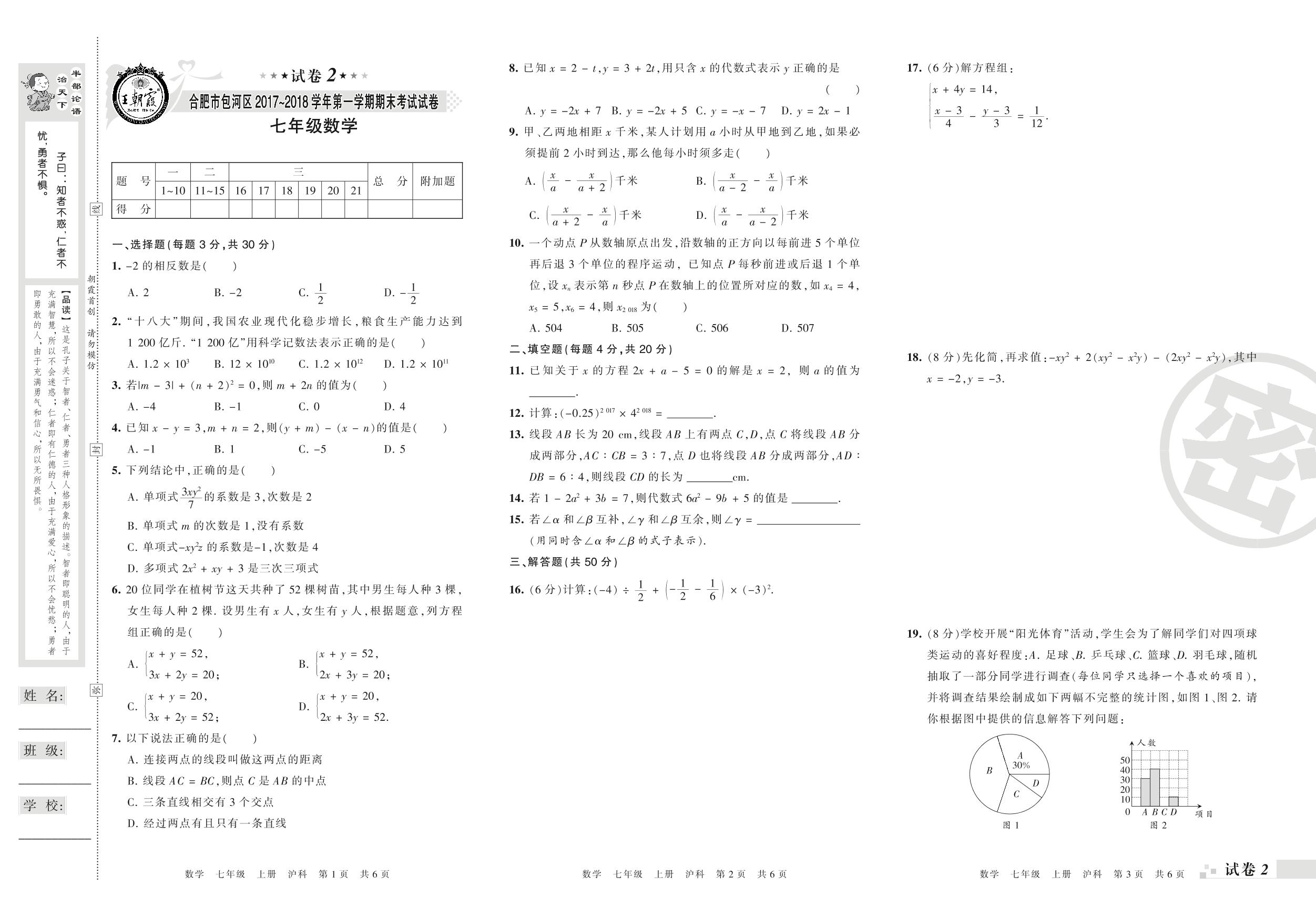 2017-2018学年第一学期合肥市包河区七年级数学试卷(沪科版)【2】