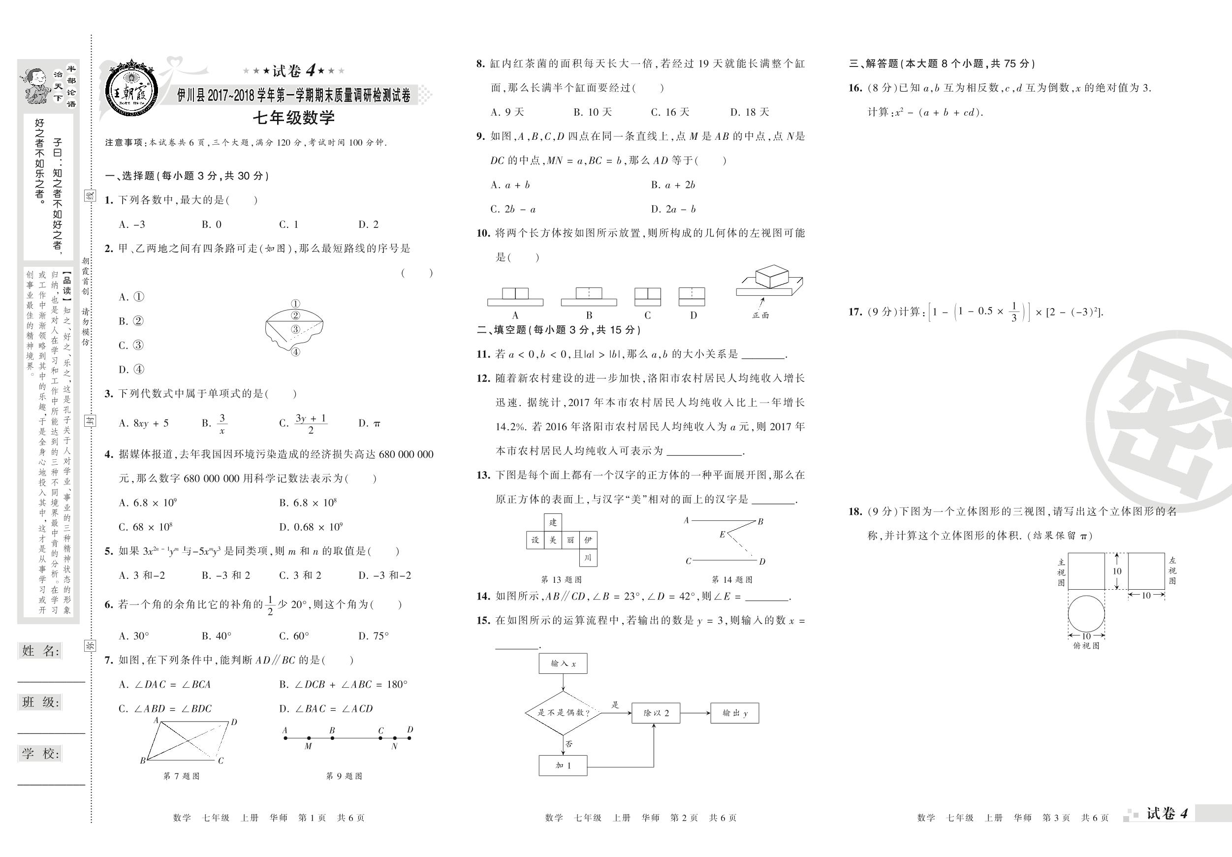 2017-2018学年第一学期洛阳市伊川县七年级数学试卷(华师版)【4】