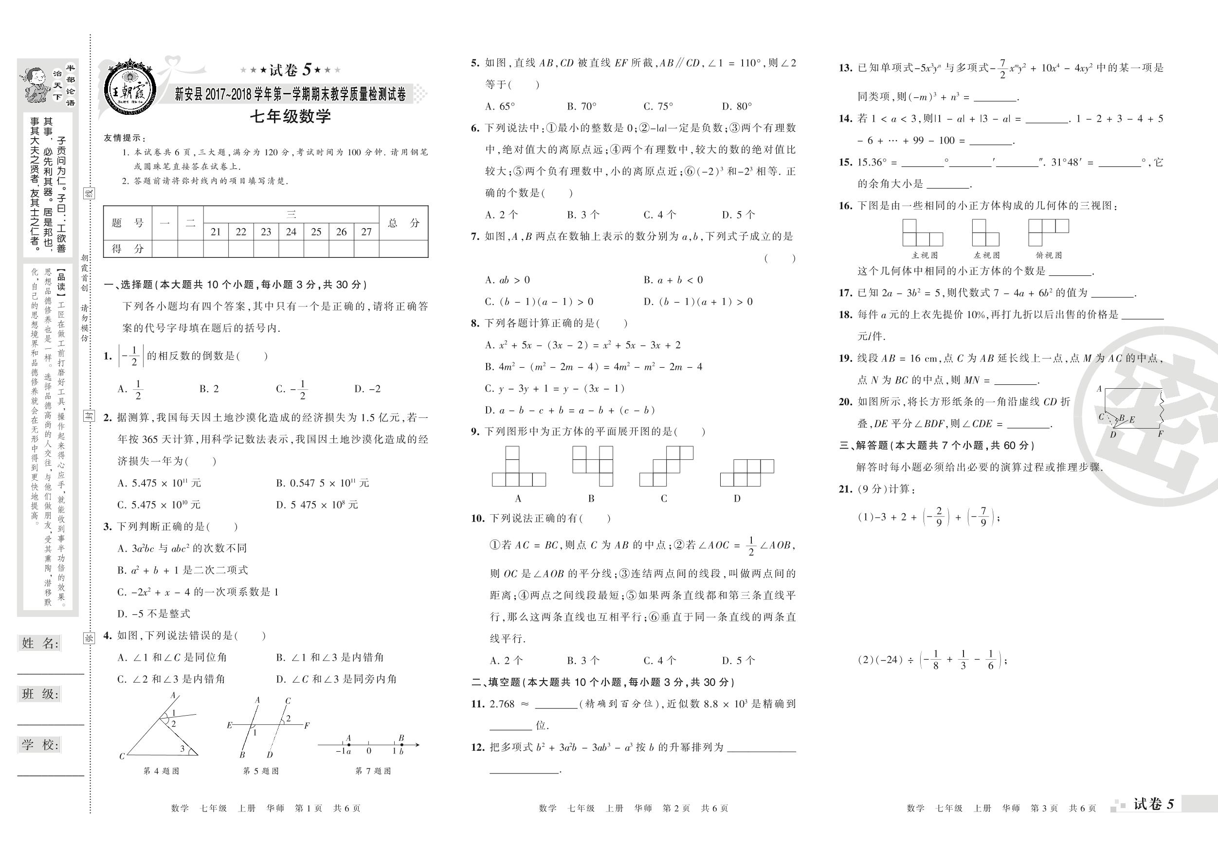 2017-2018学年第一学期洛阳市新安县七年级数学试卷(华师版)【5】
