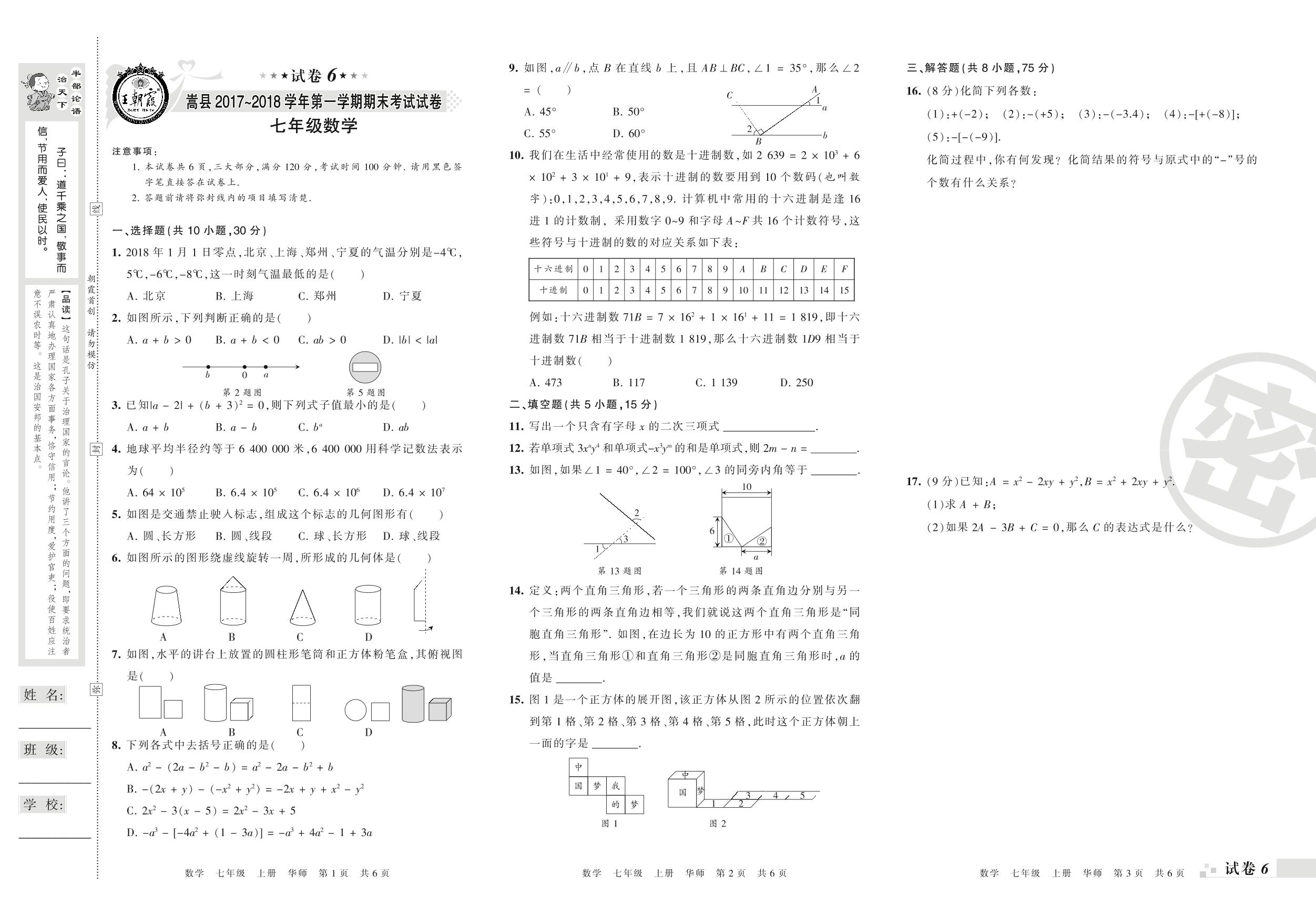 2017-2018学年第一学期洛阳市嵩县七年级数学试卷(华师版)【6】