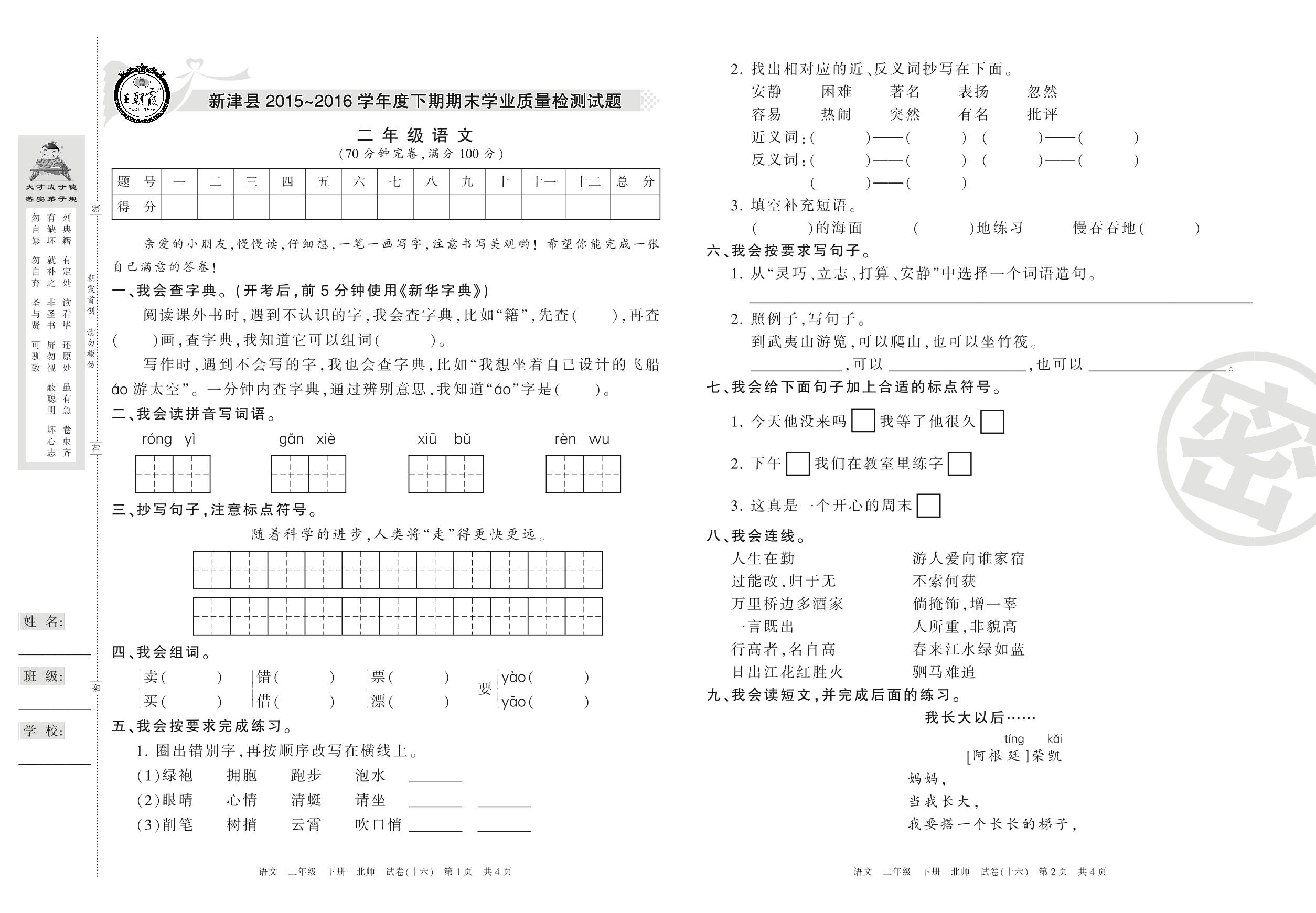2015-2016学年第二学期成都市新津县二年级语文试卷(北师版)【16】