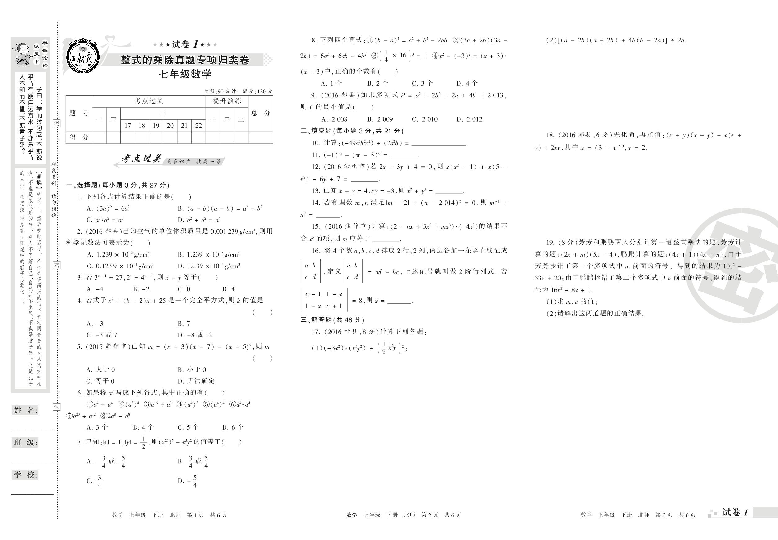 王朝霞期末专项卷——整式的乘除真题专项归类卷七年级下册数学(北师版)【1】