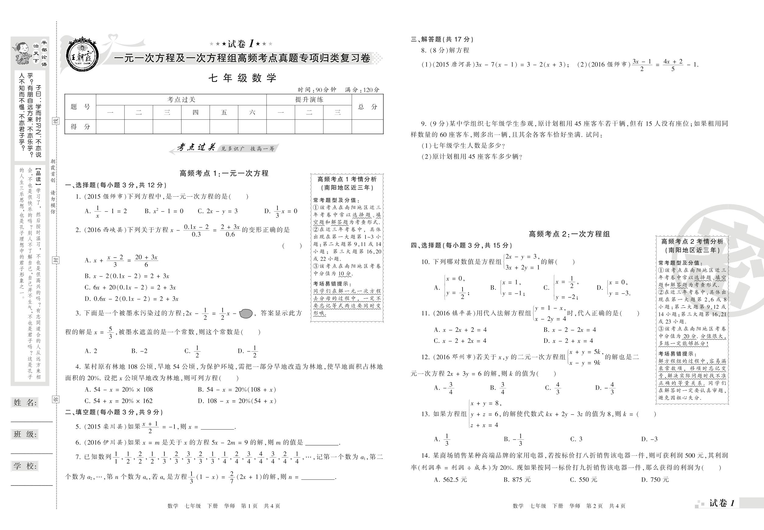 王朝霞期末专项卷——一元一次方程及一次方程组高频考点真题专项归类复习卷七年级下册数学(华师版)【1】
