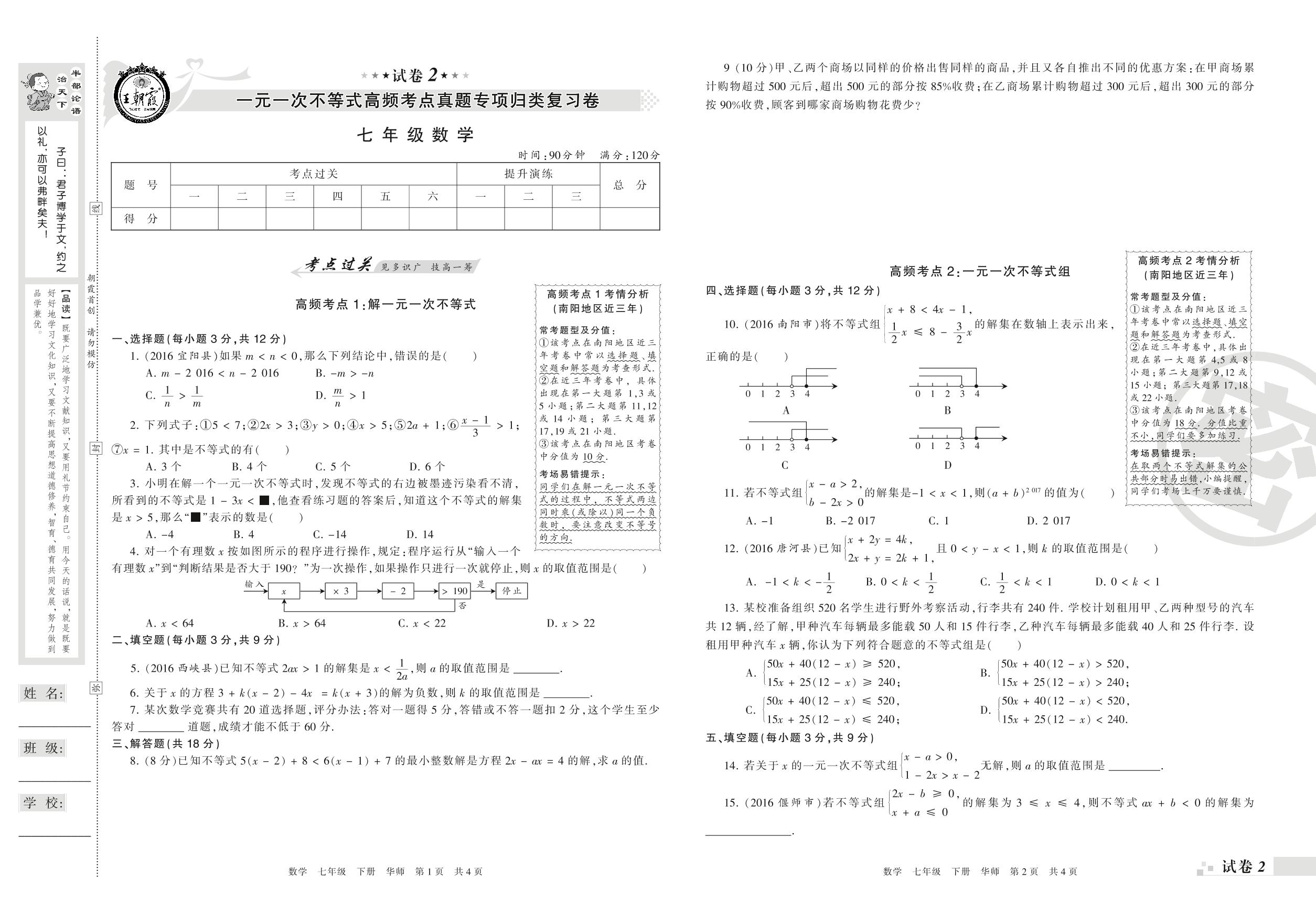 王朝霞期末专项卷——一元一次不等式高频考点真题专项归类复习卷七年级下册数学(华师版)【2】