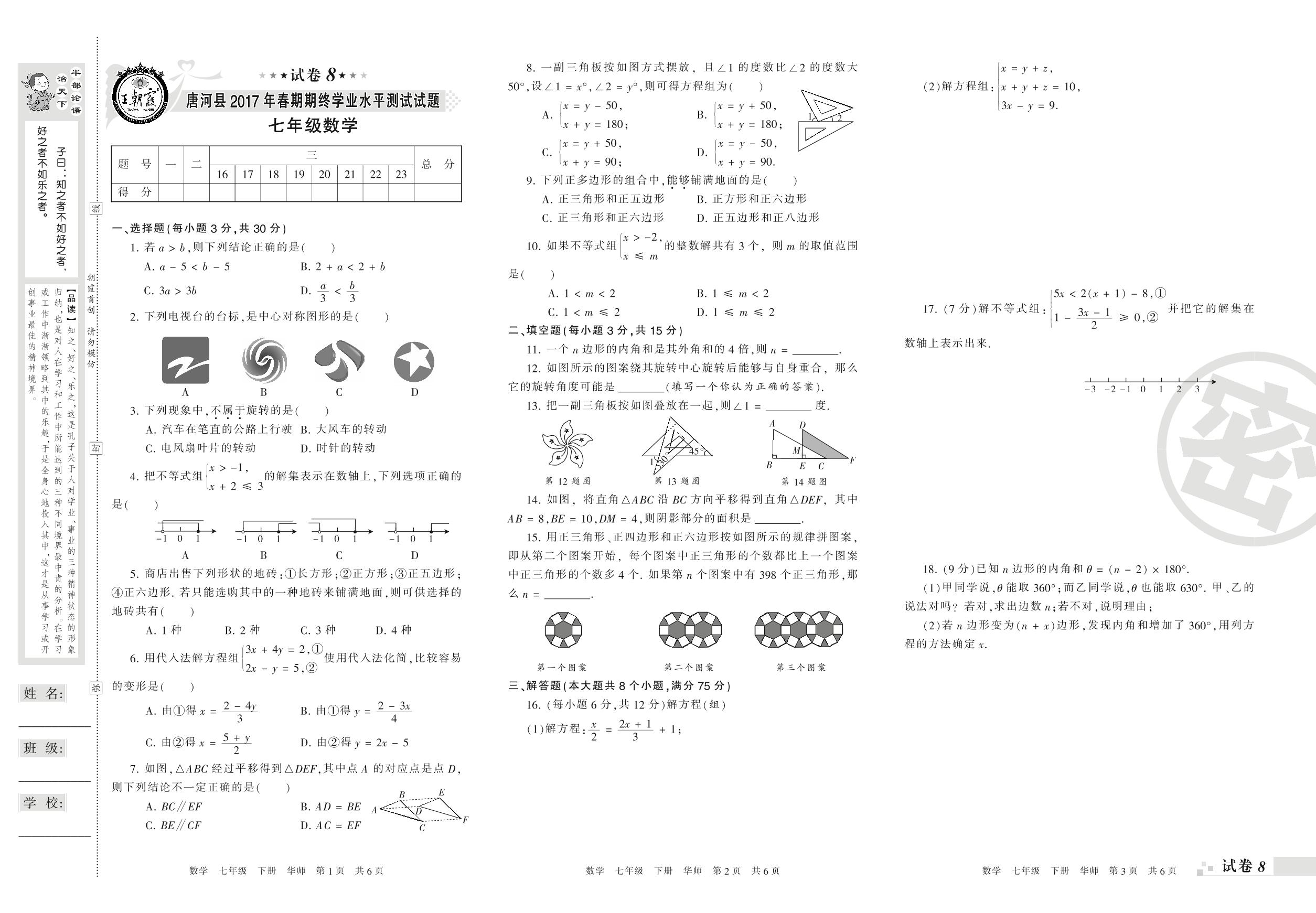 2016-2017学年第二学期南阳市唐河县七年级数学试卷(华师版)【8】