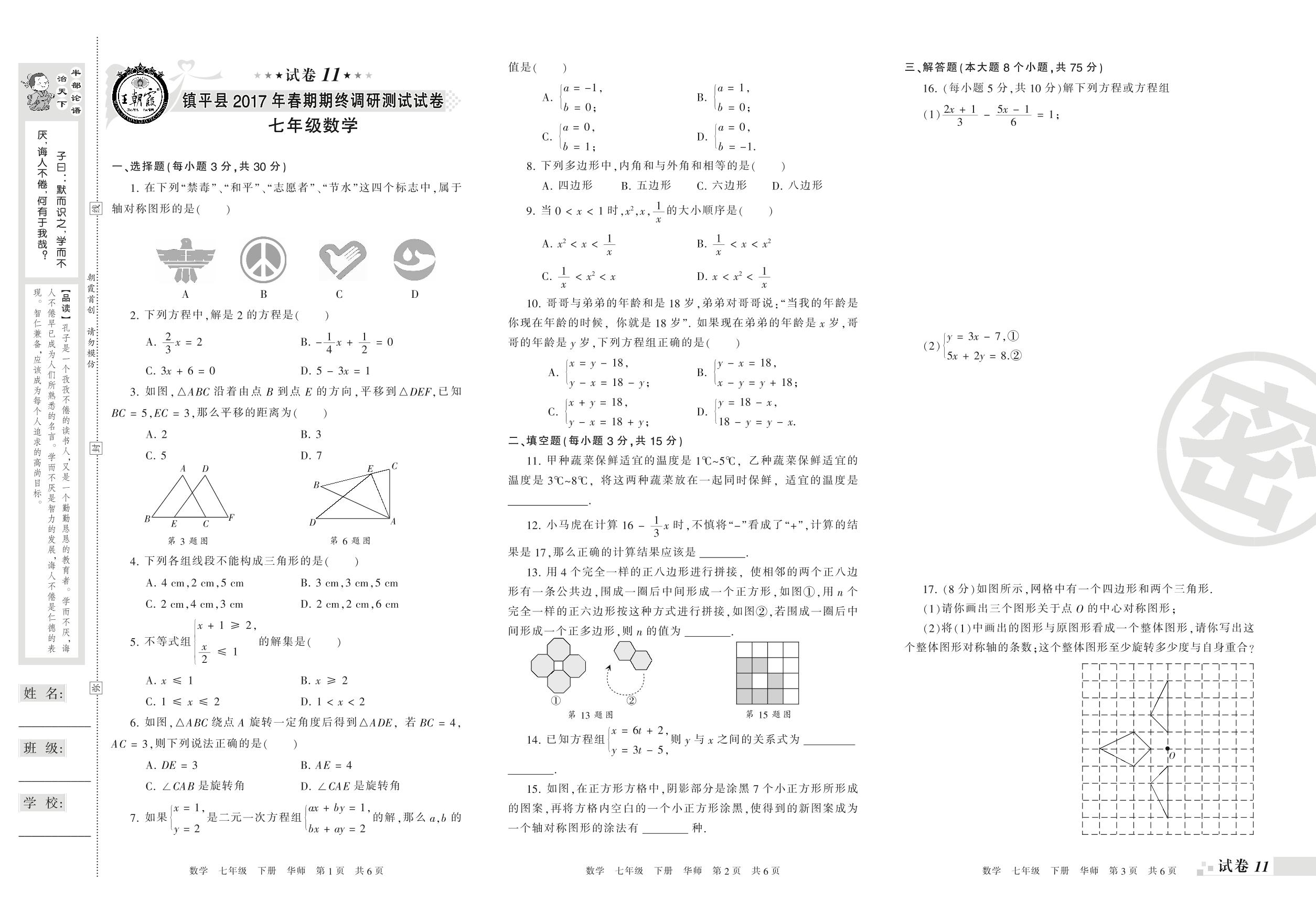 2016-2017学年第二学期南阳市镇平县七年级数学试卷(华师版)【11】