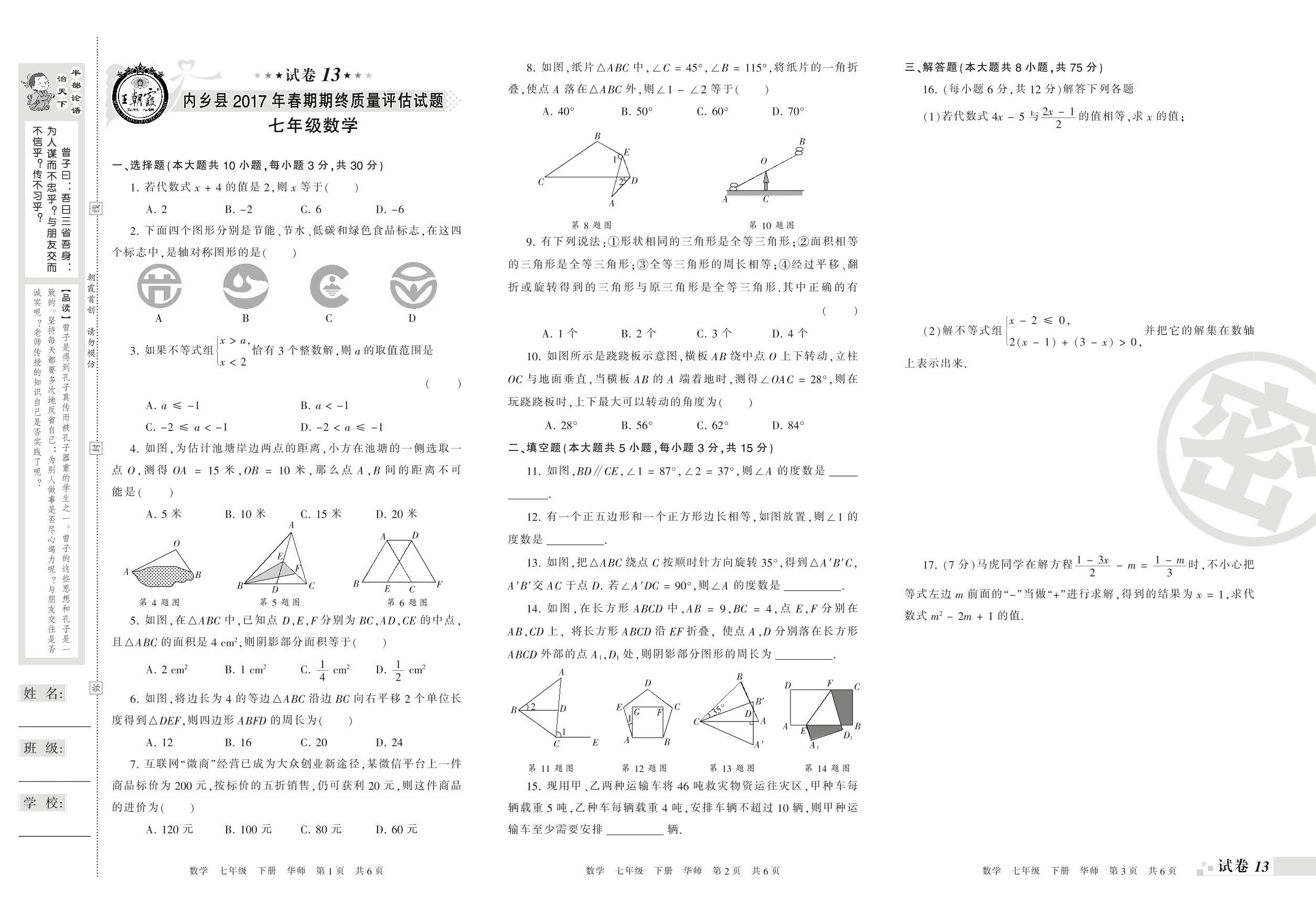 2016-2017学年第二学期南阳市内乡县七年级数学试卷(华师版)【13】