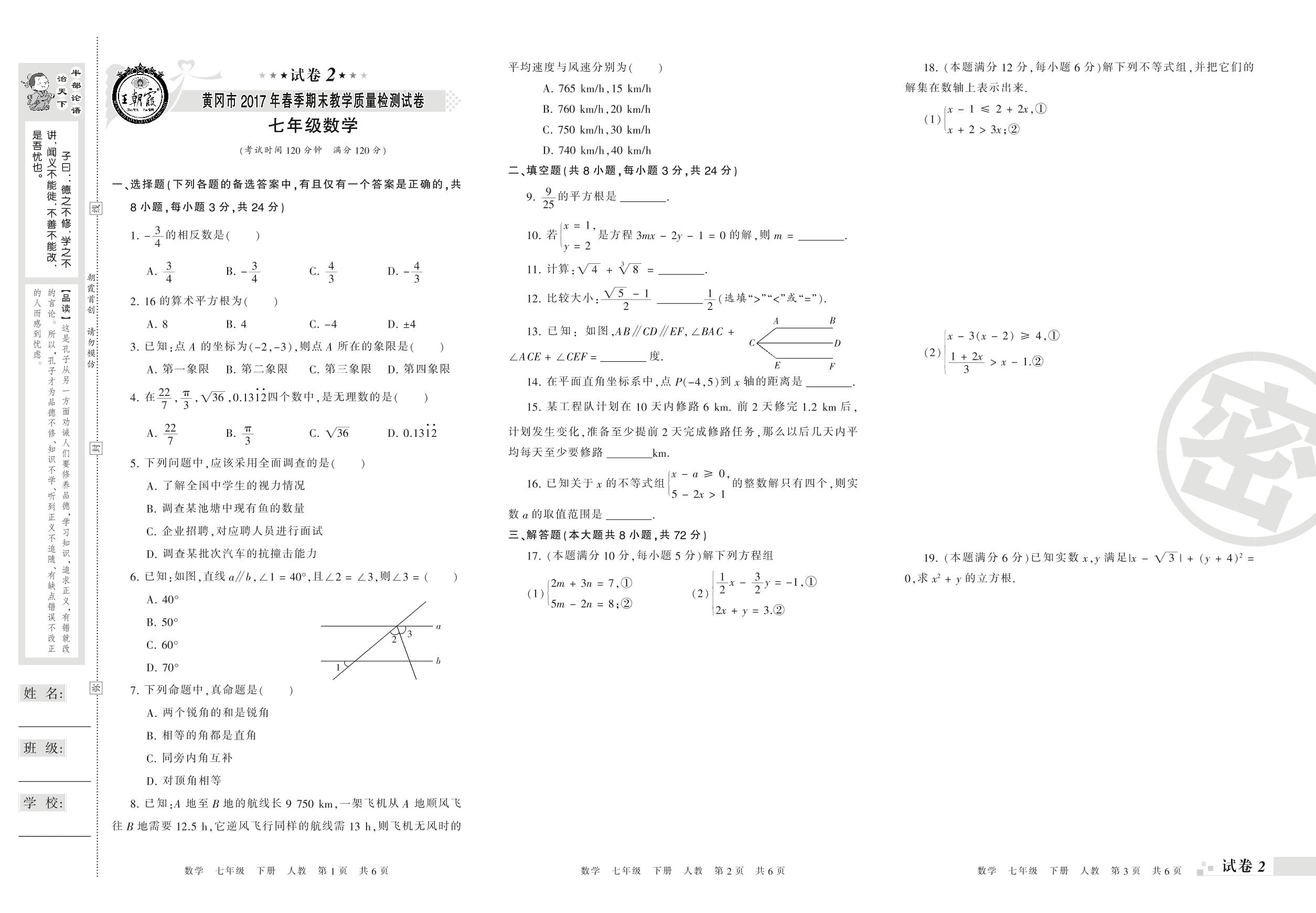 2016-2017学年第二学期黄冈市七年级数学试卷(人教版)【2】