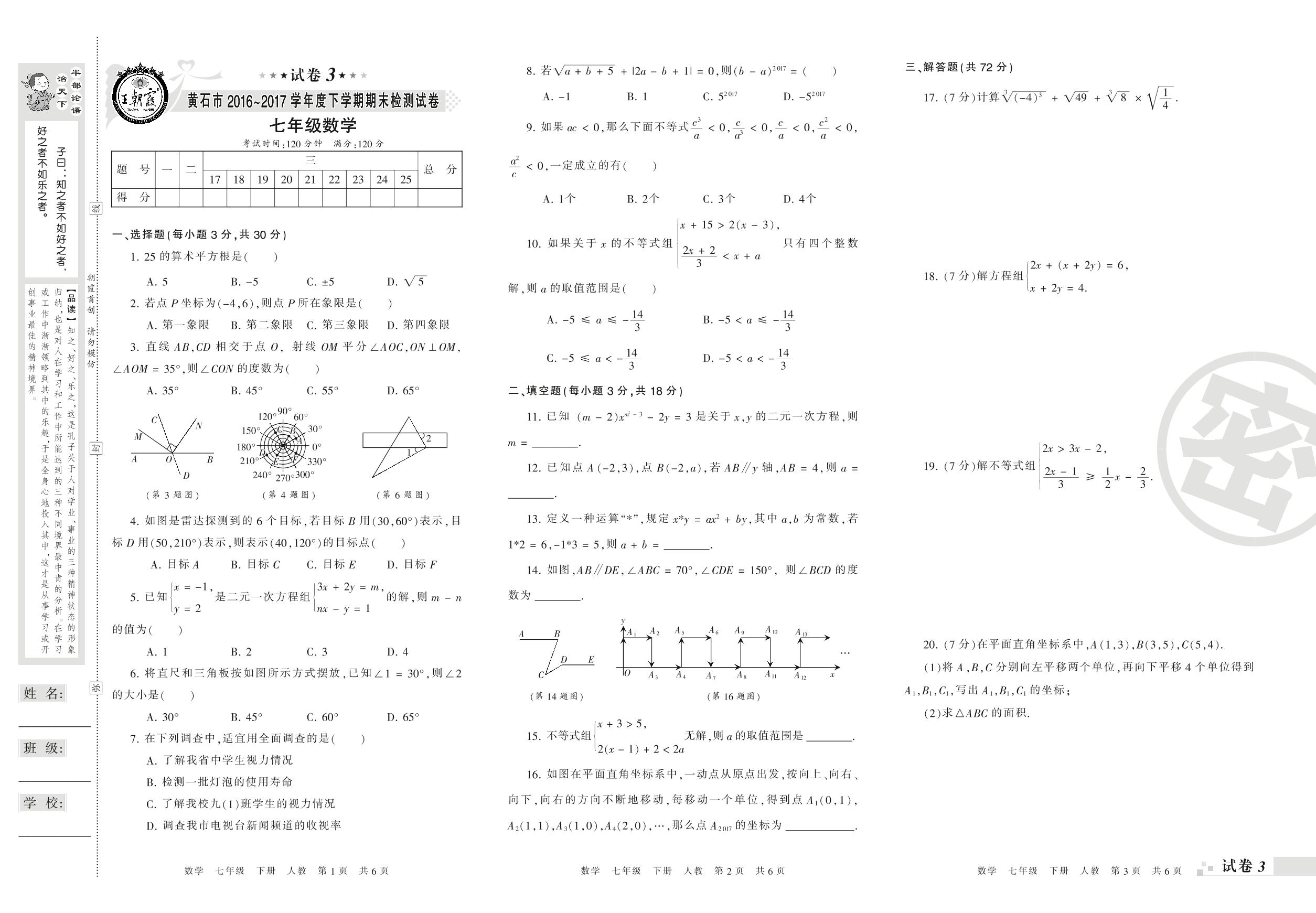 2016-2017学年第二学期黄石市七年级数学试卷(人教版)【3】