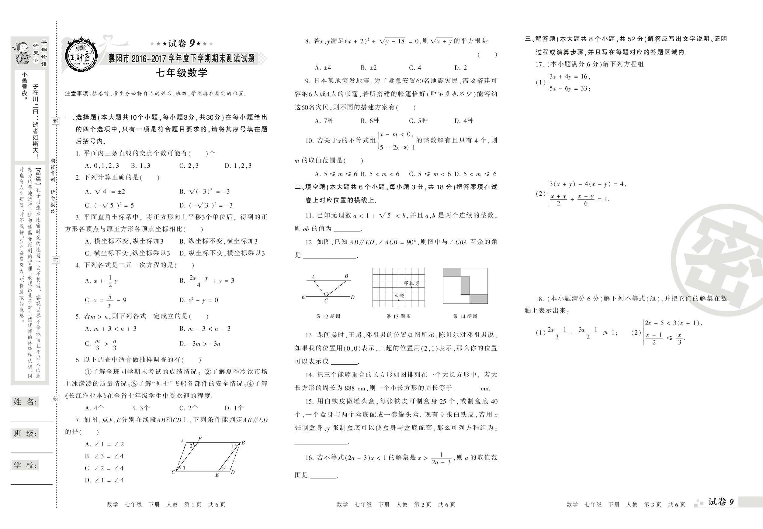 2016-2017学年第二学期襄阳市七年级数学试卷(人教版)【9】