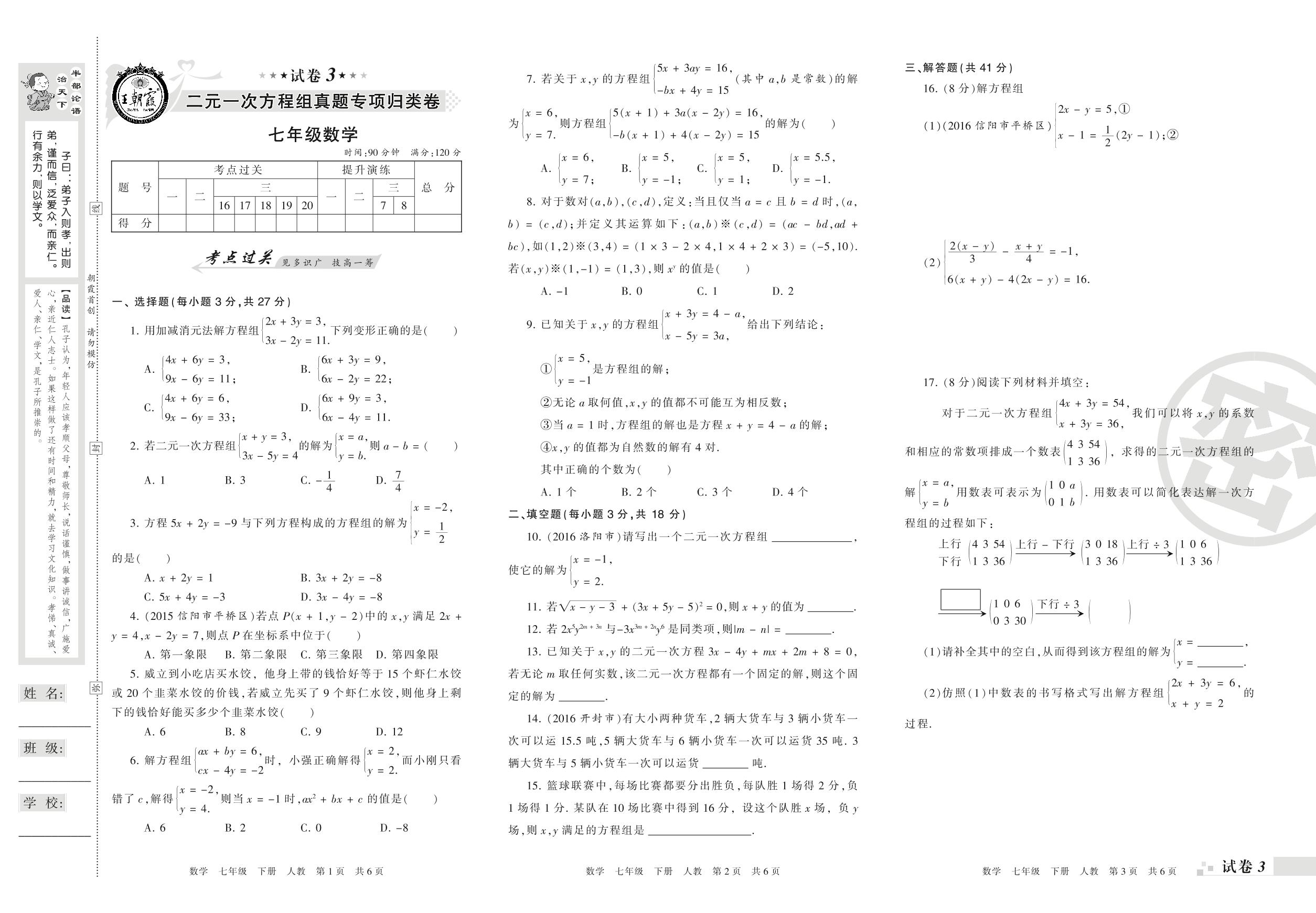 王朝霞期末专项卷——二元一次方程组真题专项归类卷七年级下册数学(人教版)【3】