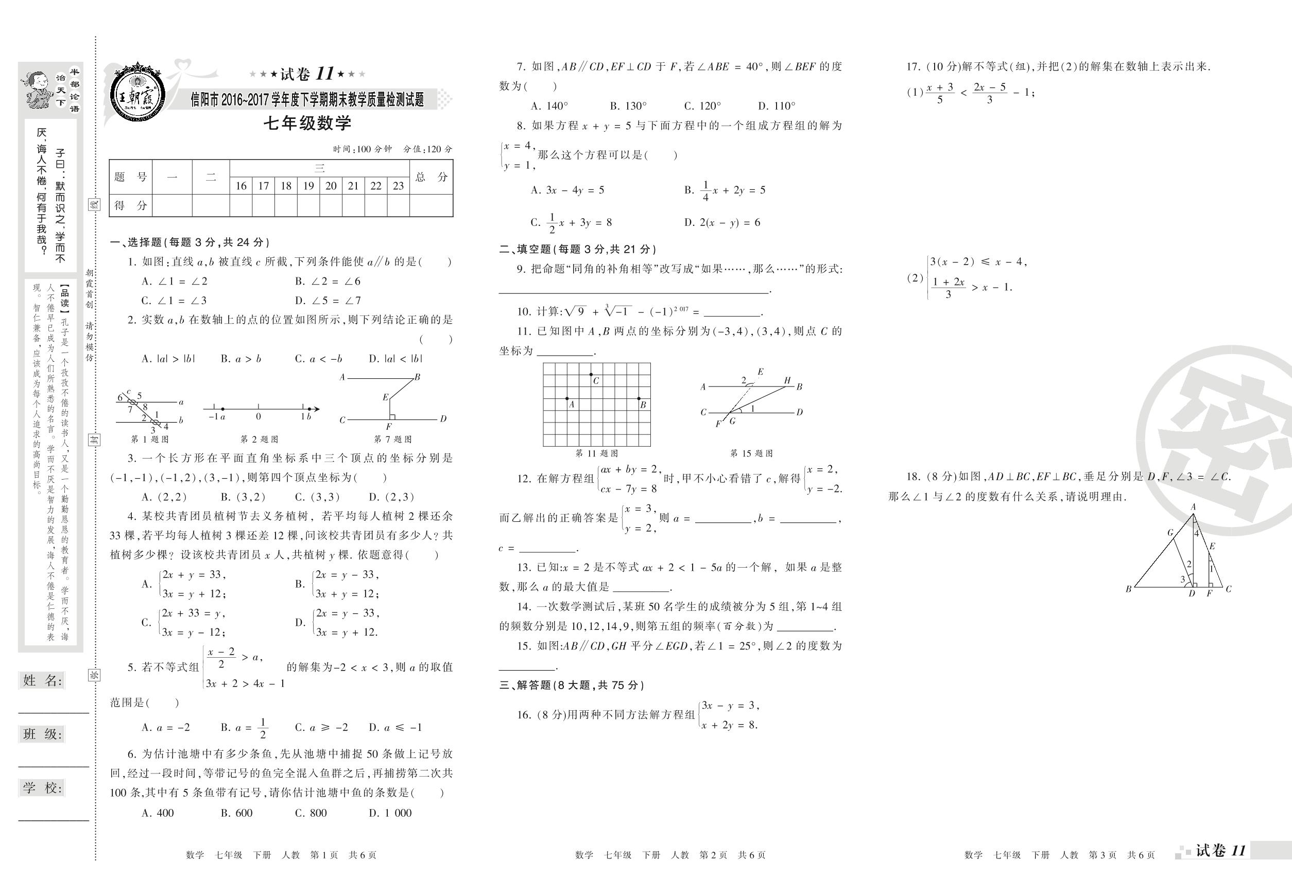 2016-2017学年第二学期信阳市七年级数学试卷(人教版)【11】