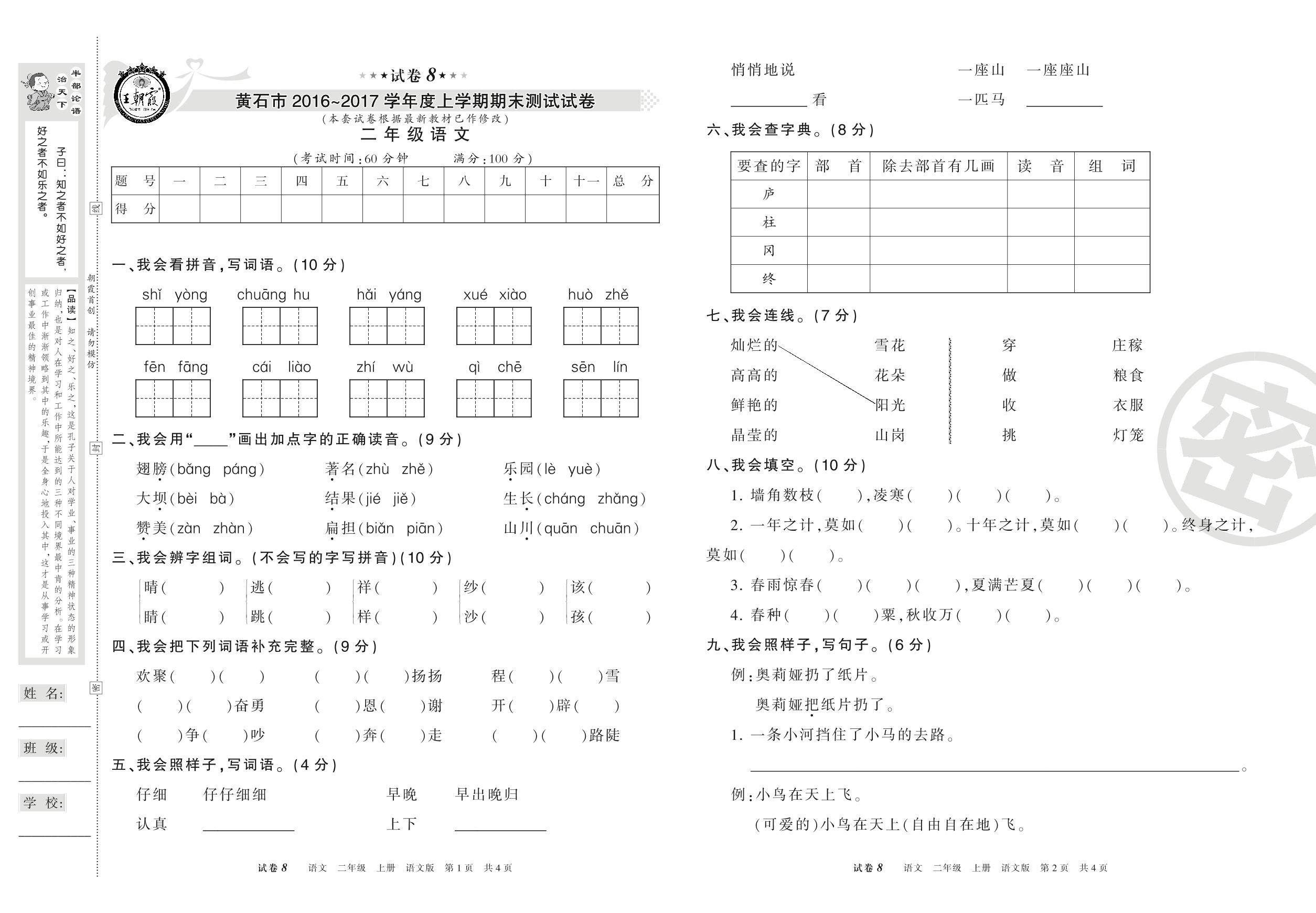 2016-2017学年第一学期黄石市二年级语文试卷(语文版)【8】