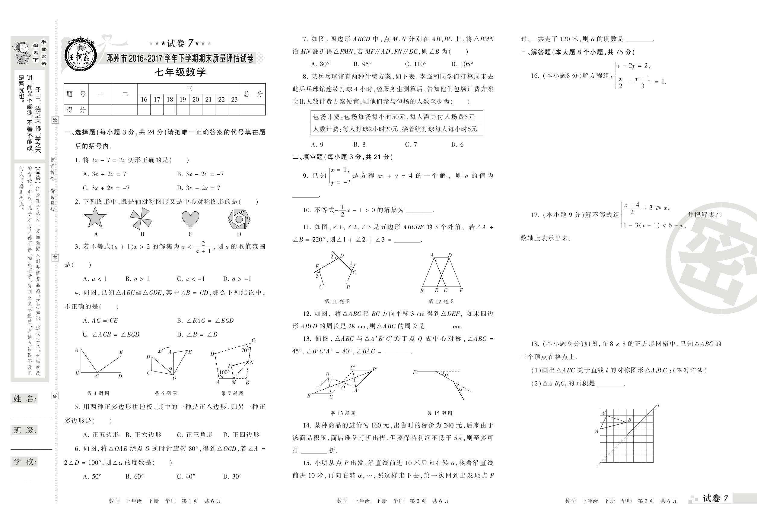 七年级数学华师版下册期末卷