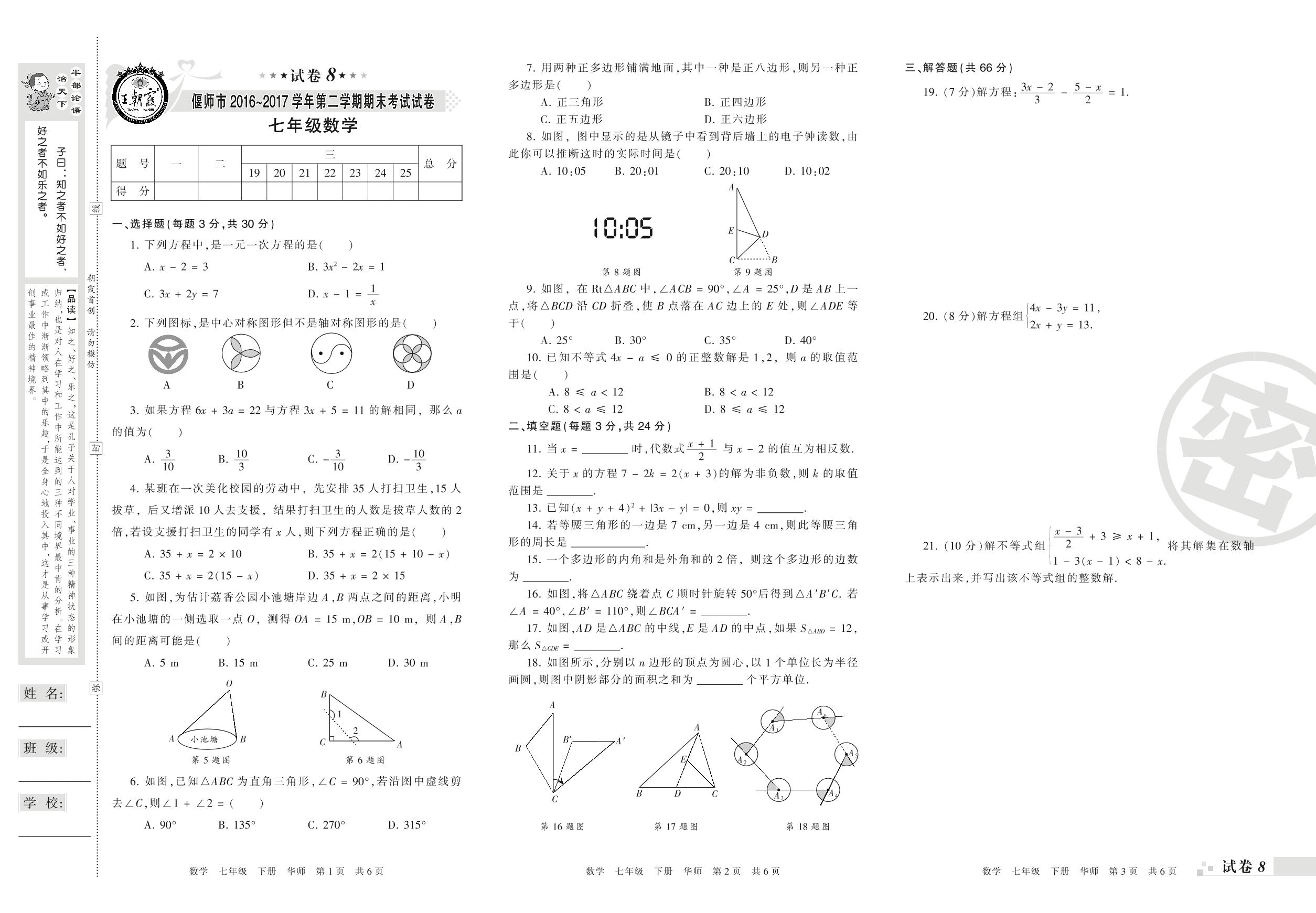 2016-2017学年第二学期偃师市七年级数学试卷(华师版)【8】