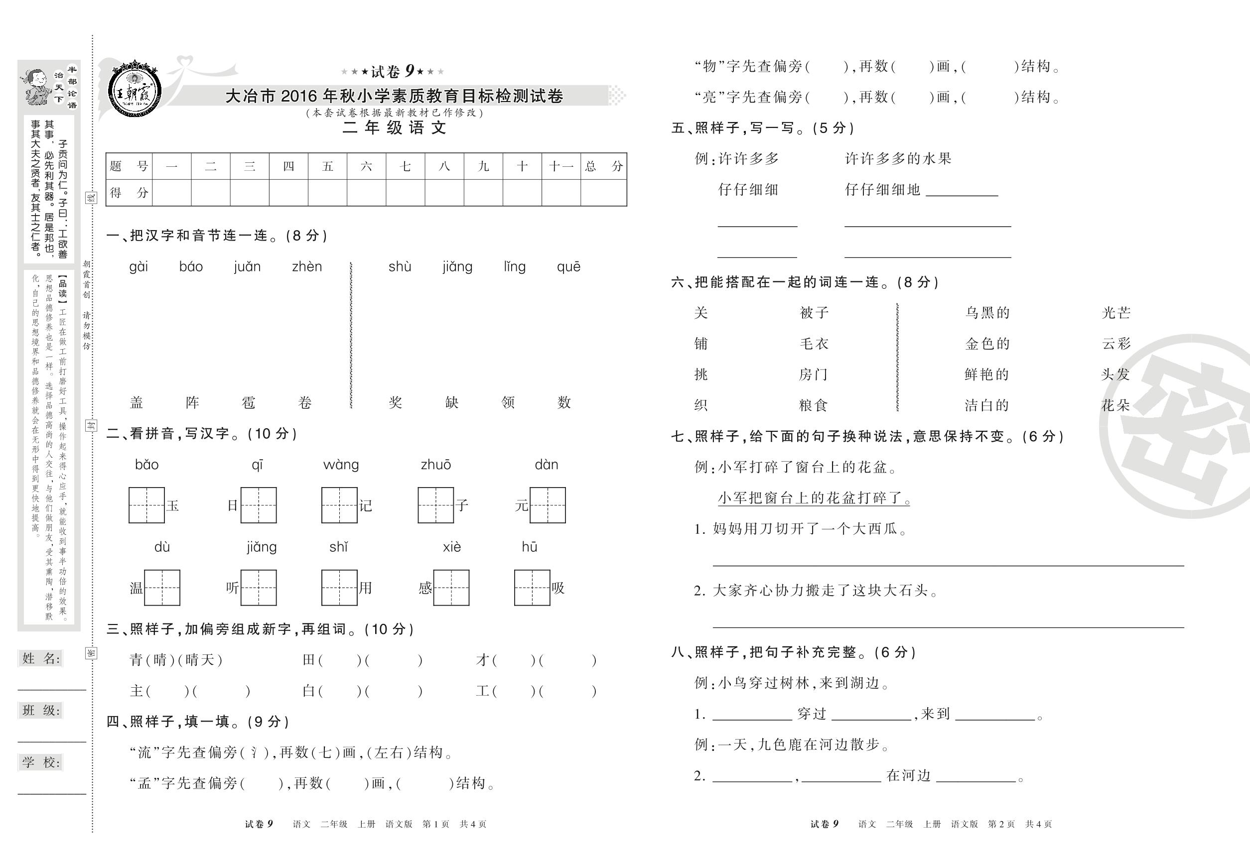 2016-2017学年第一学期大冶市二年级语文试卷(语文版)【9】