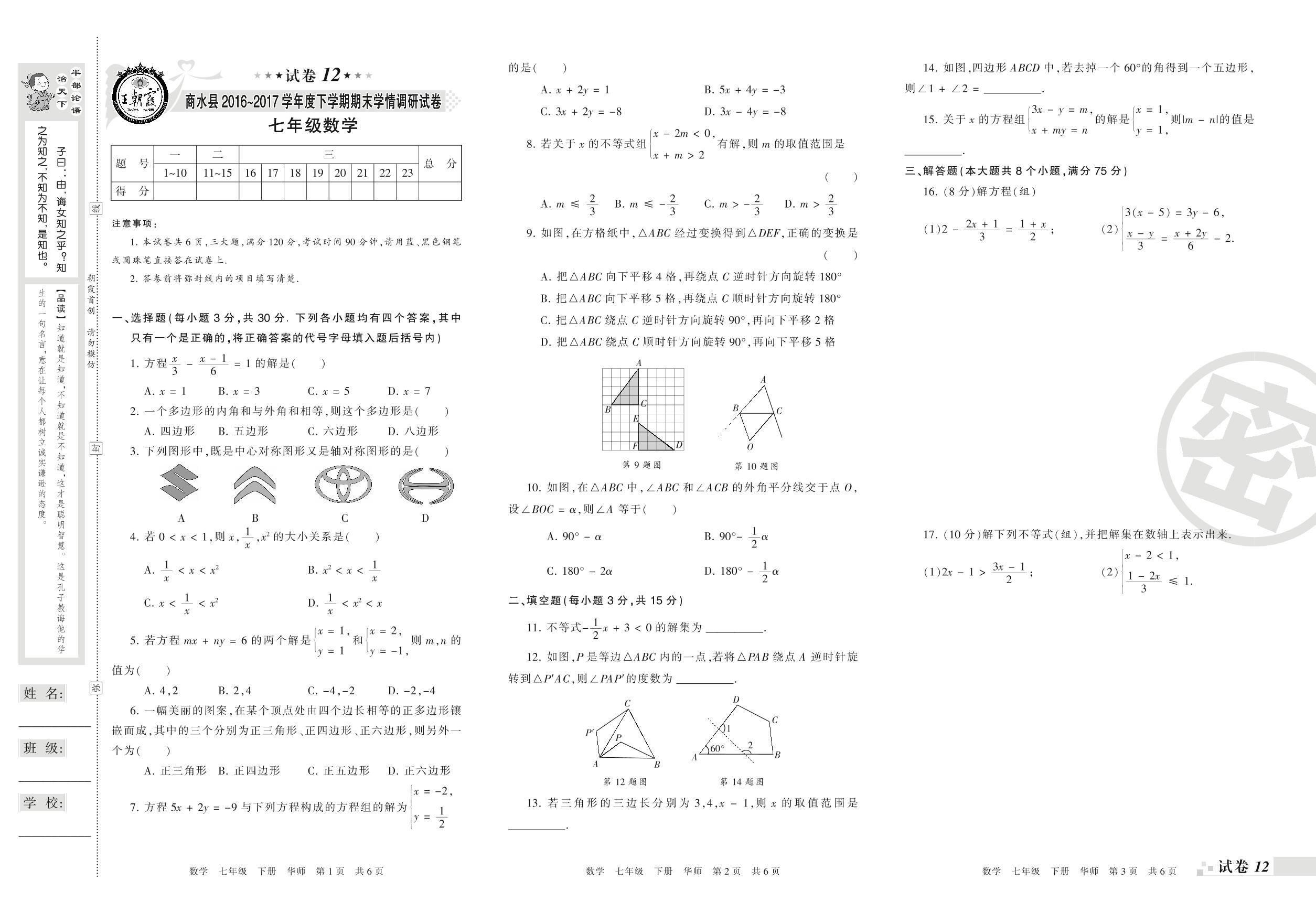 2016-2017学年第二学期周口市商水县七年级数学试卷(华师版)【12】