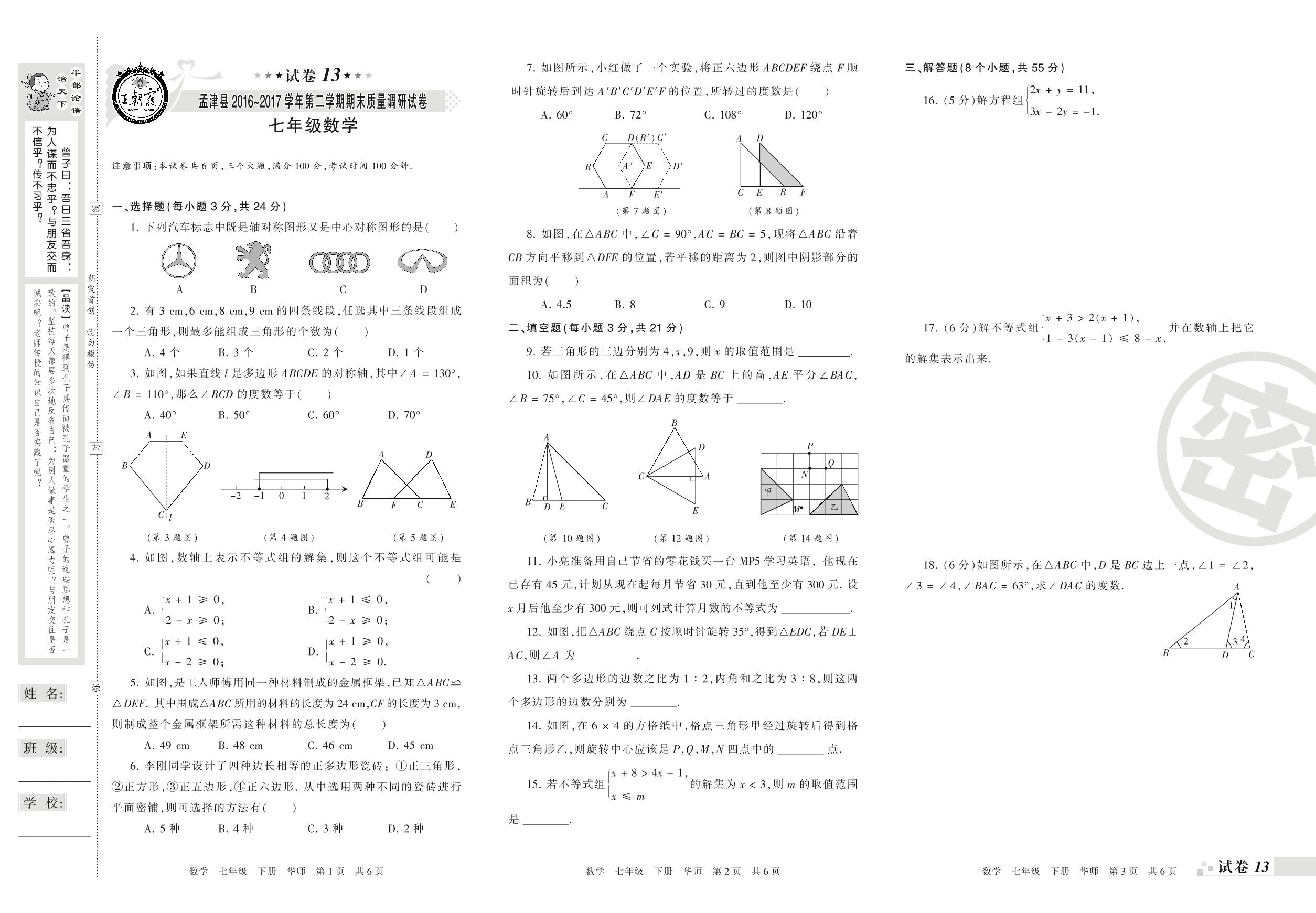2016-2017学年第二学期洛阳市孟津县七年级数学试卷(华师版)【13】