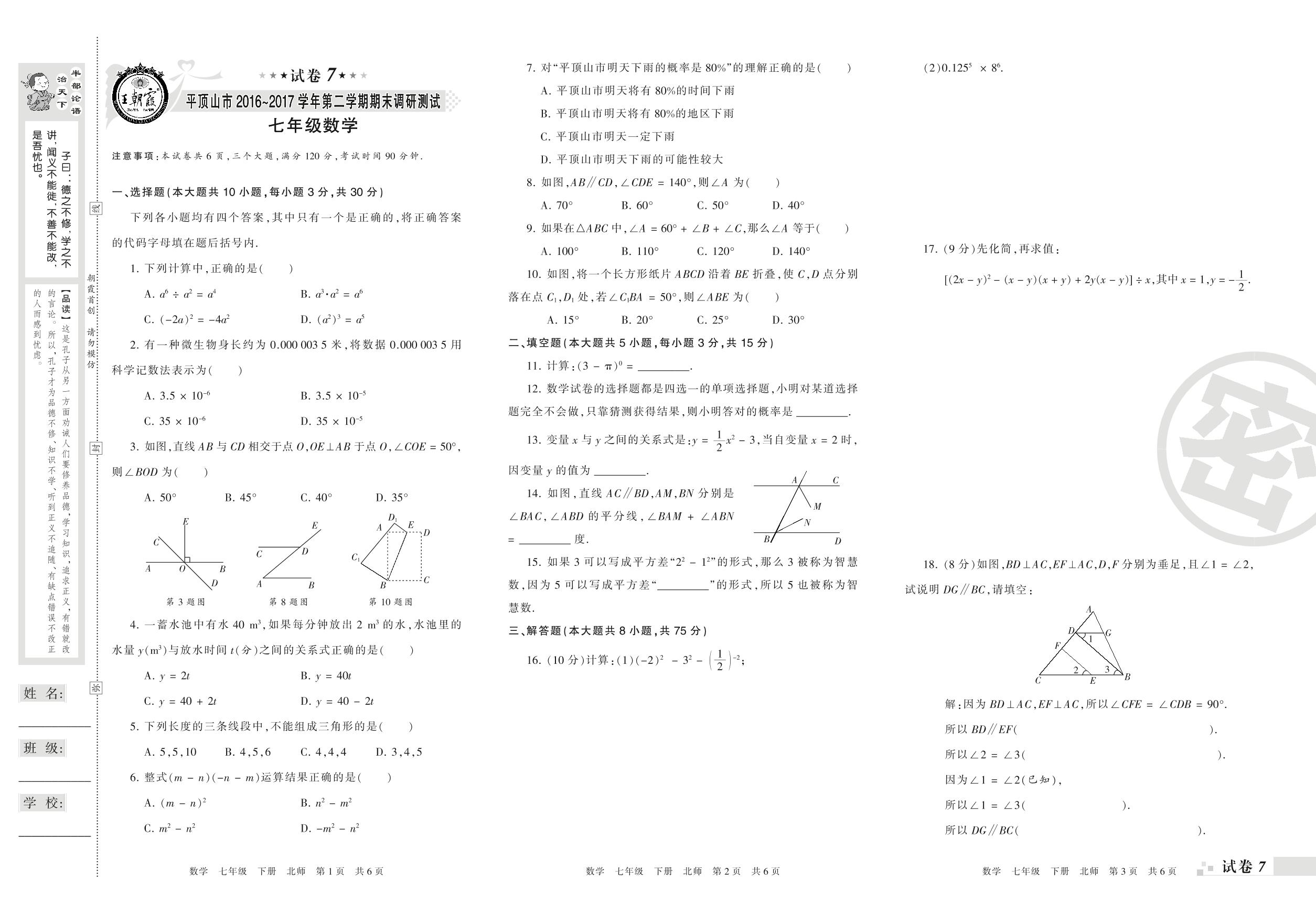 七年级数学北师版下册期末卷