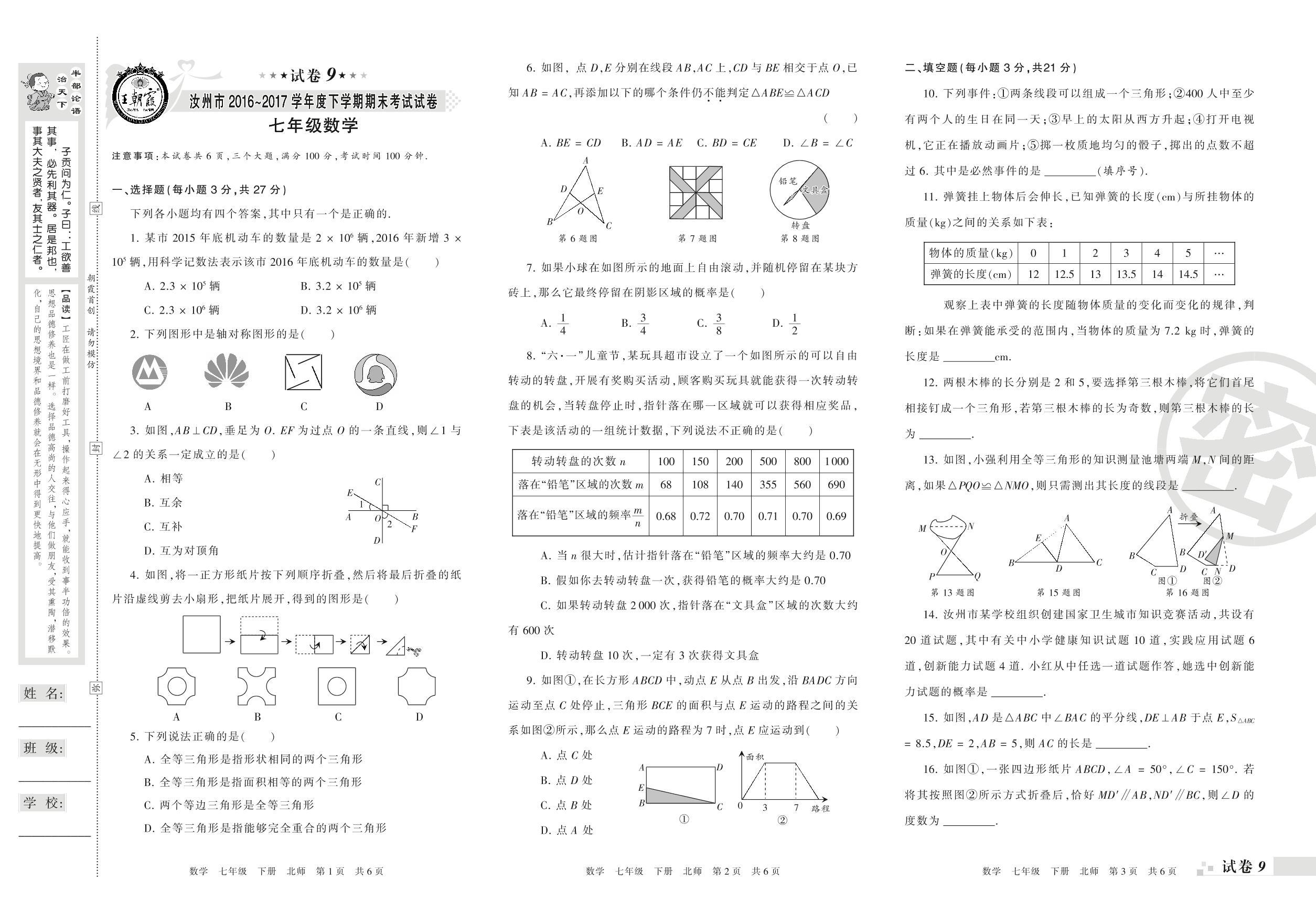 2016-2017学年第二学期汝州市七年级数学试卷(北师版)【9】