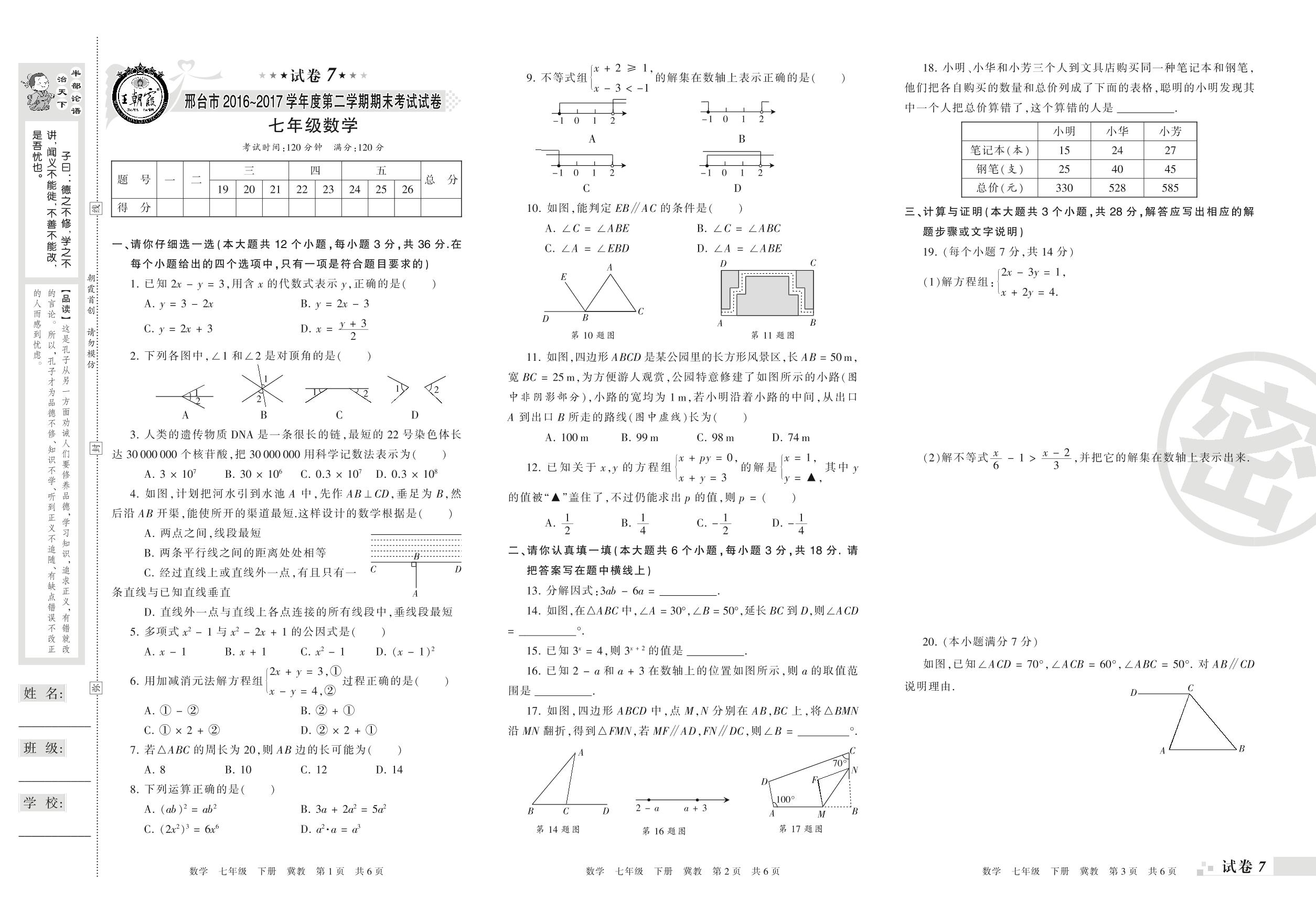 七年级数学冀教版下册期末卷