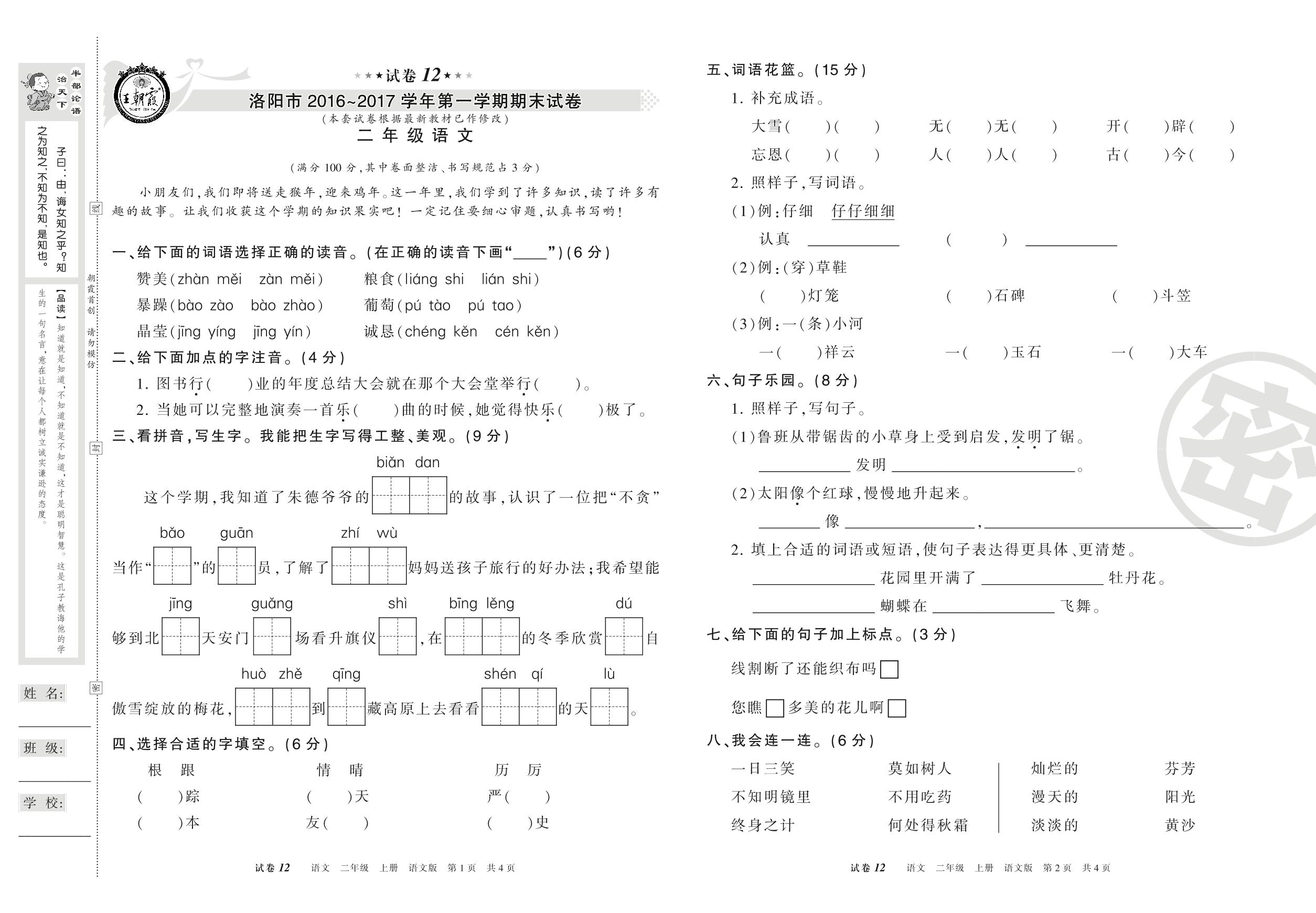 2016-2017学年第一学期洛阳市二年级语文试卷(语文版)【12】