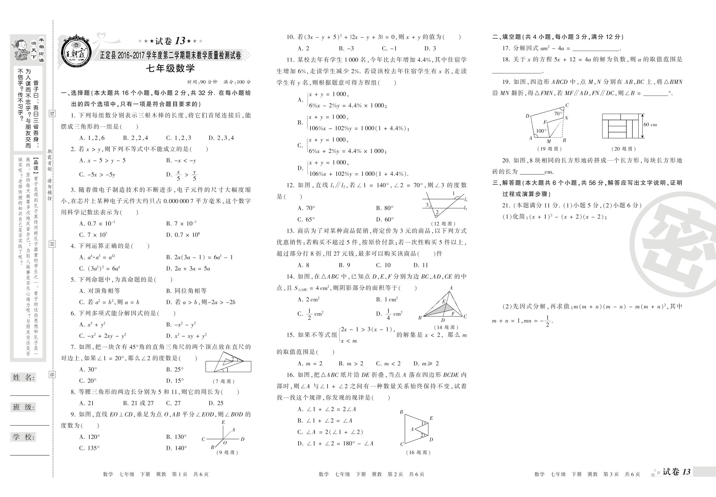 2016-2017学年第二学期石家庄市正定县七年级数学试卷(冀教版)【13】