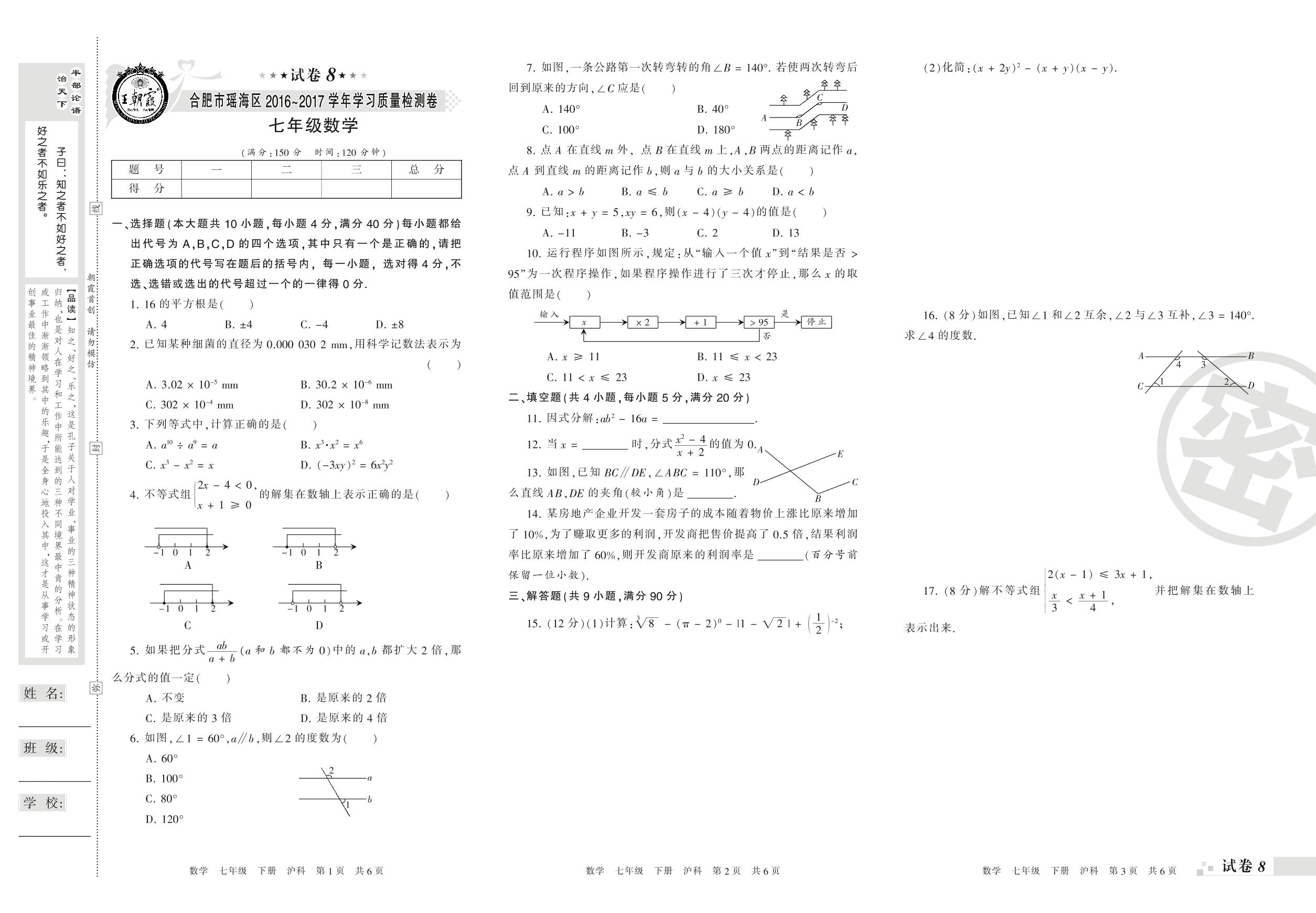 2016-2017学年第二学期合肥市瑶海区七年级数学试卷(沪科版)【8】