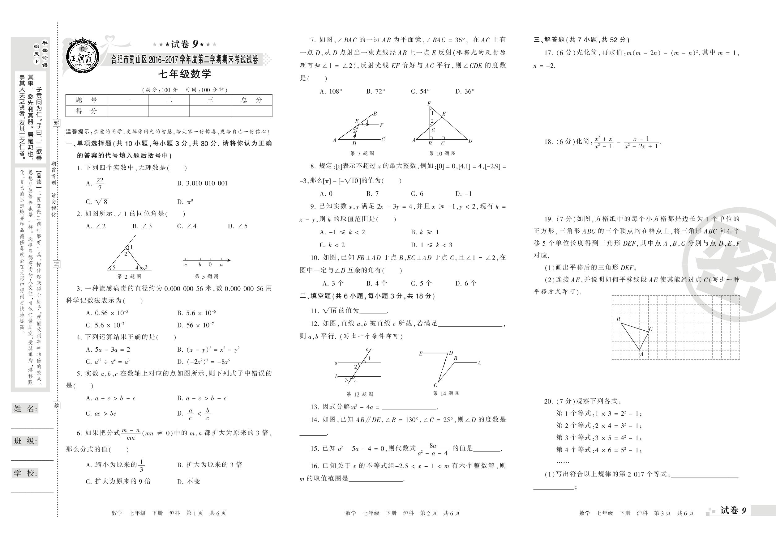 2016-2017学年第二学期合肥市蜀山区七年级数学试卷(沪科版)【9】