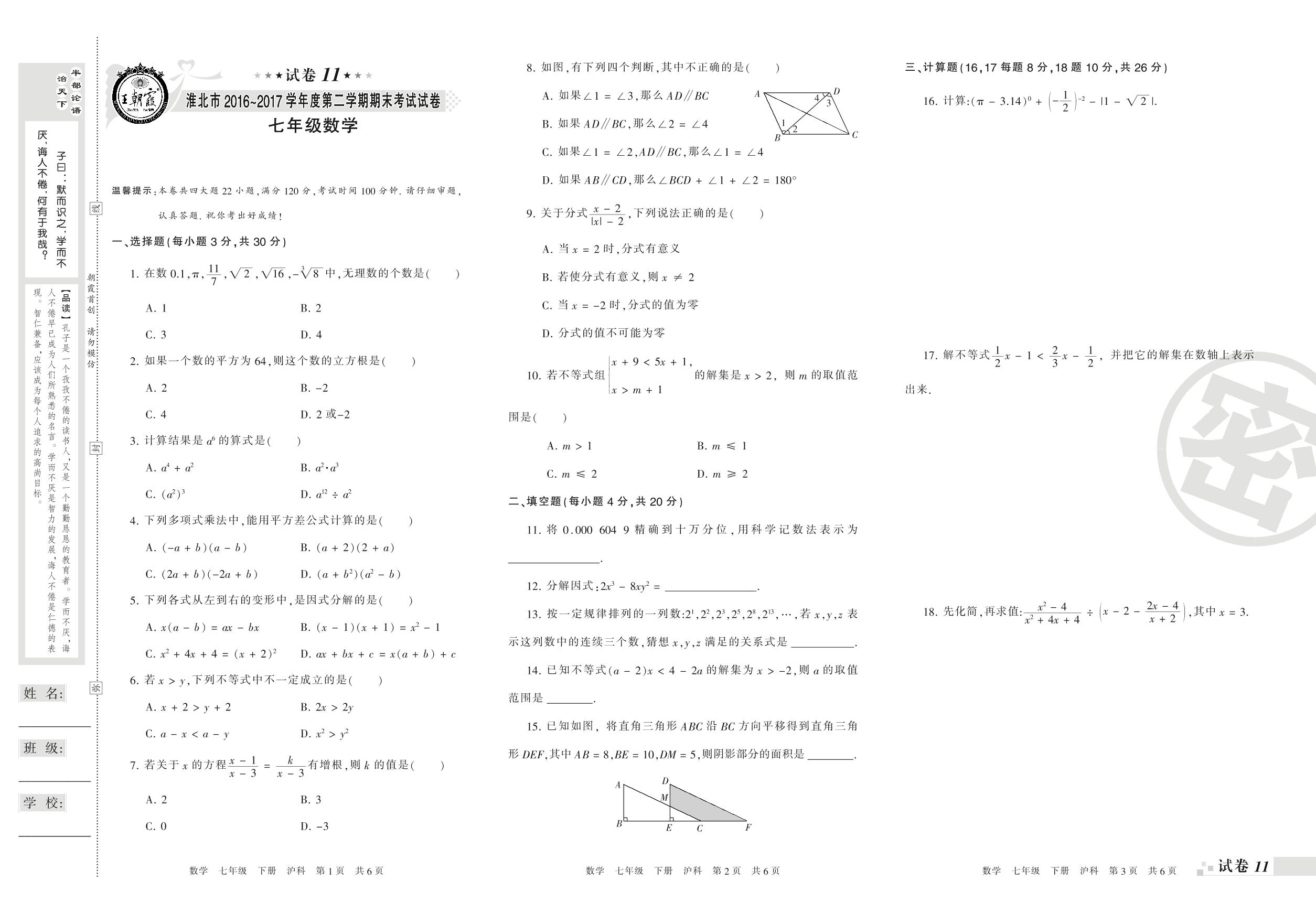 2016-2017学年第二学期淮北市七年级数学试卷(沪科版)【11】