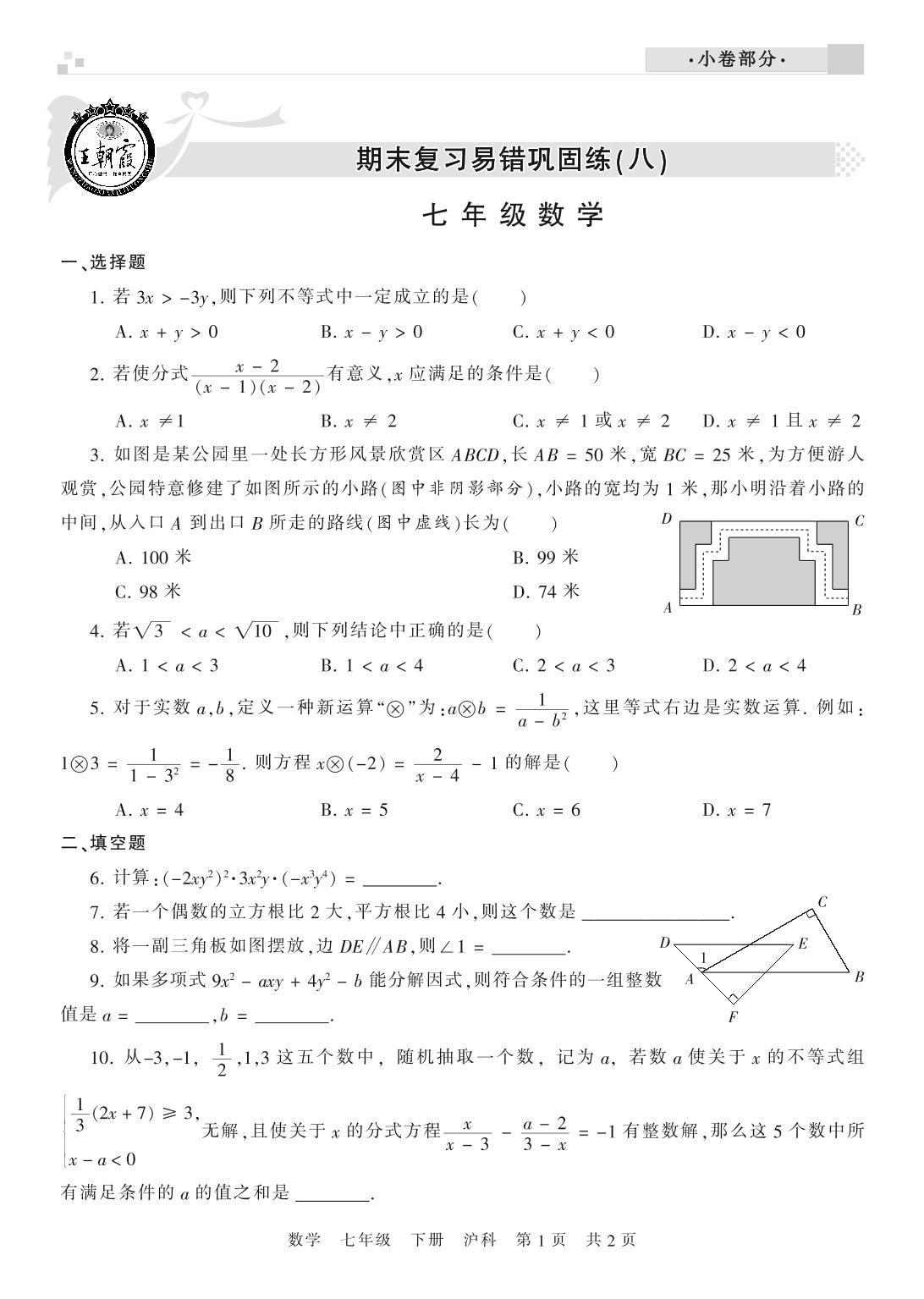 王朝霞期末小卷——期末复习易错巩固练(八)七年级下册数学(沪科版)【0】