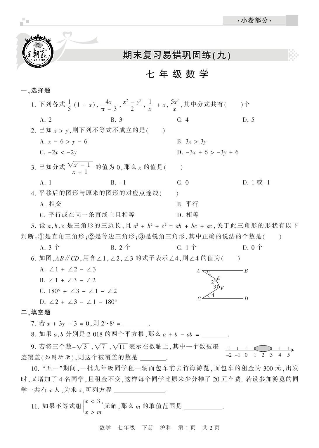 王朝霞期末小卷——期末复习易错巩固练(九)七年级下册数学(沪科版)【0】