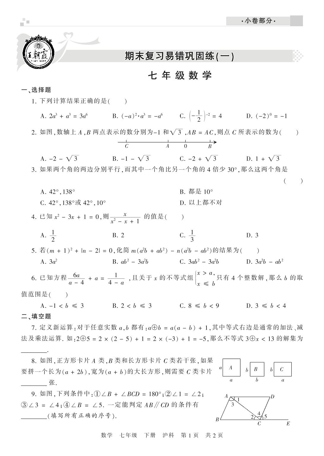 王朝霞期末小卷——期末复习易错巩固练(一)七年级下册数学(沪科版)【0】