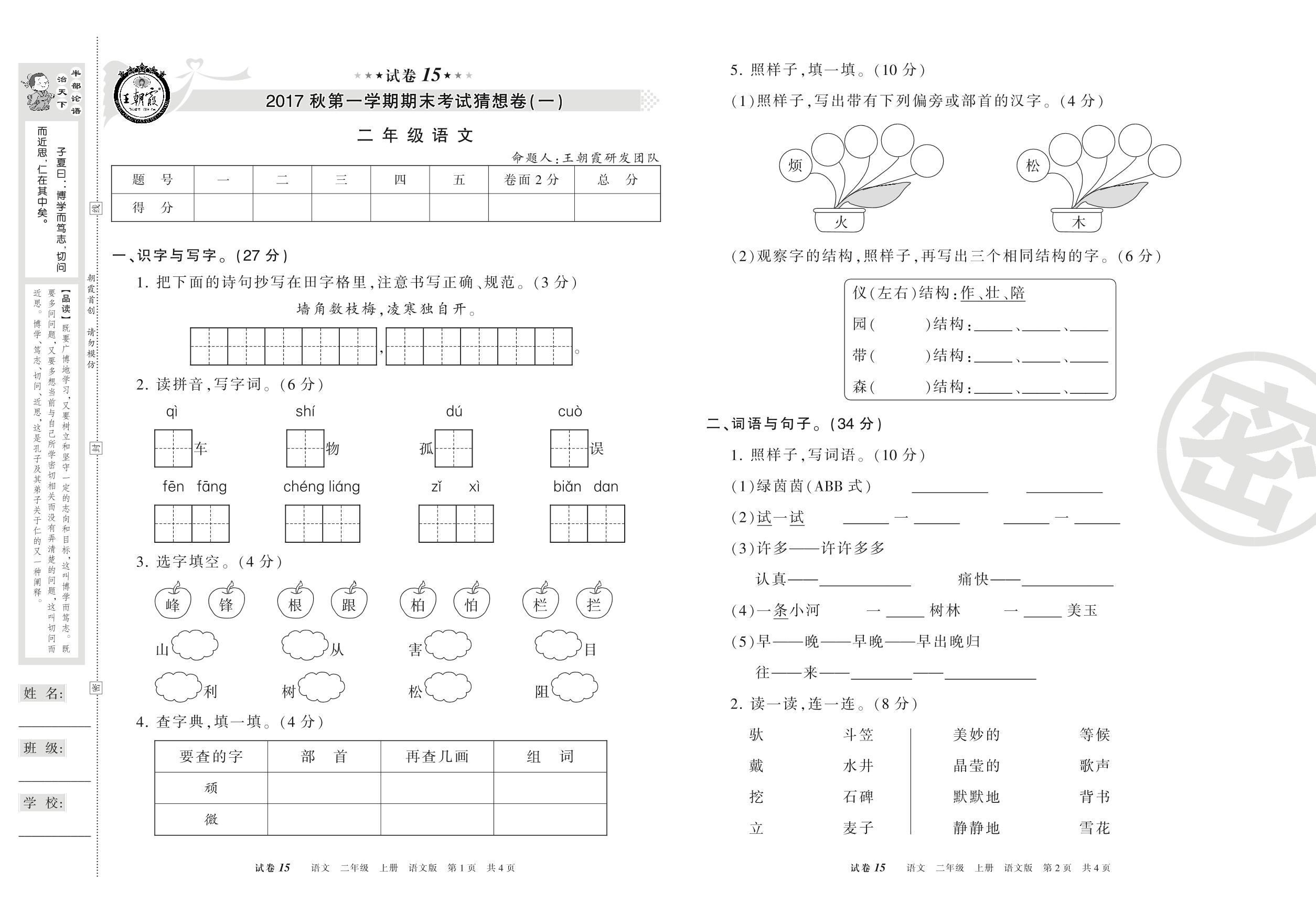王朝霞期末猜想卷二年级上册语文(语文版)【15】