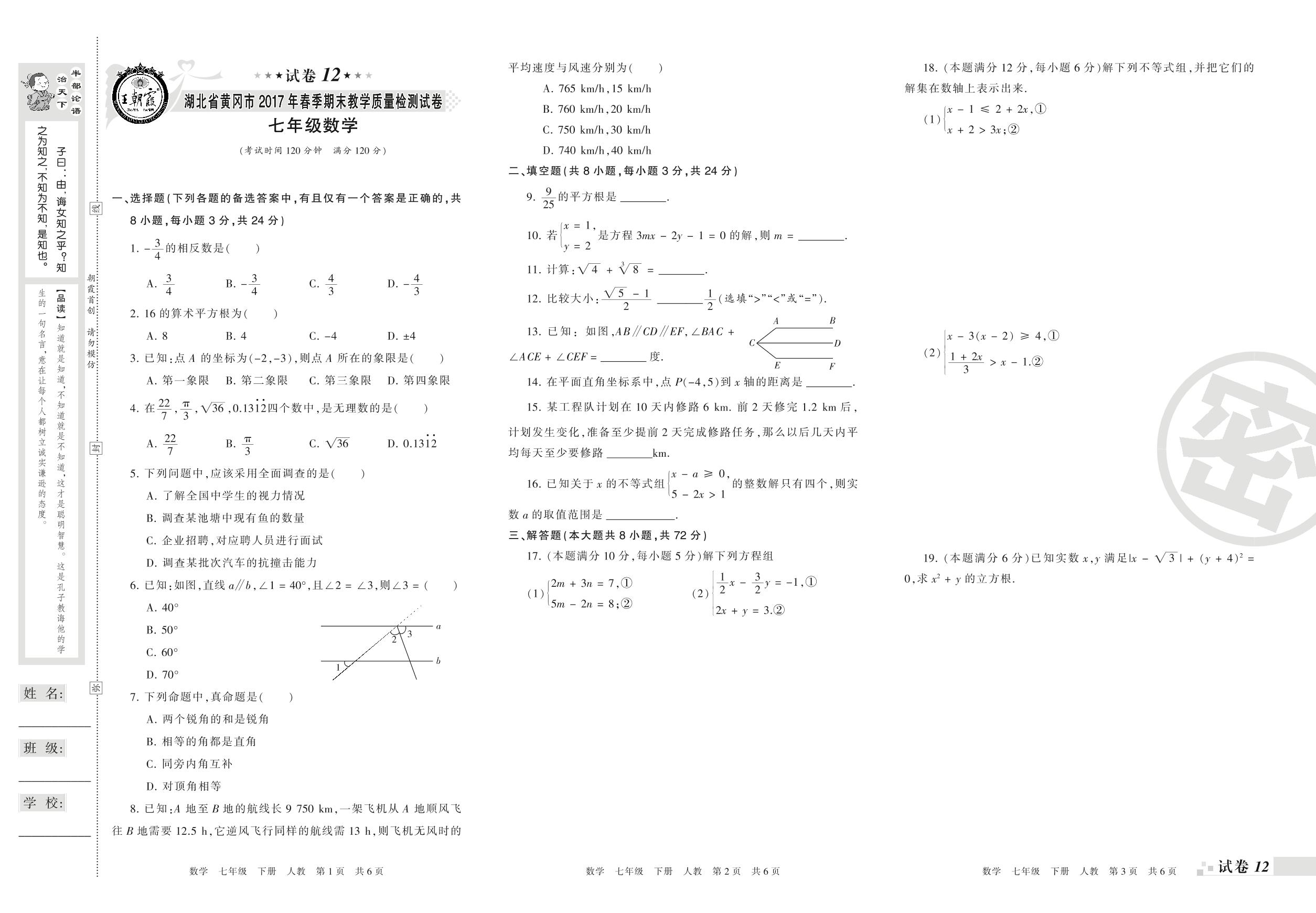 2016-2017学年第二学期湖北省黄冈市七年级数学试卷(人教版)【12】