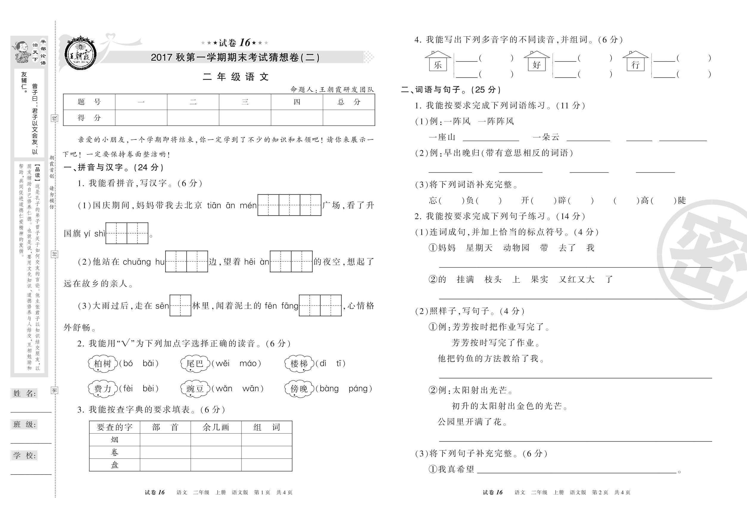 王朝霞期末猜想卷二年级上册语文(语文版)【16】