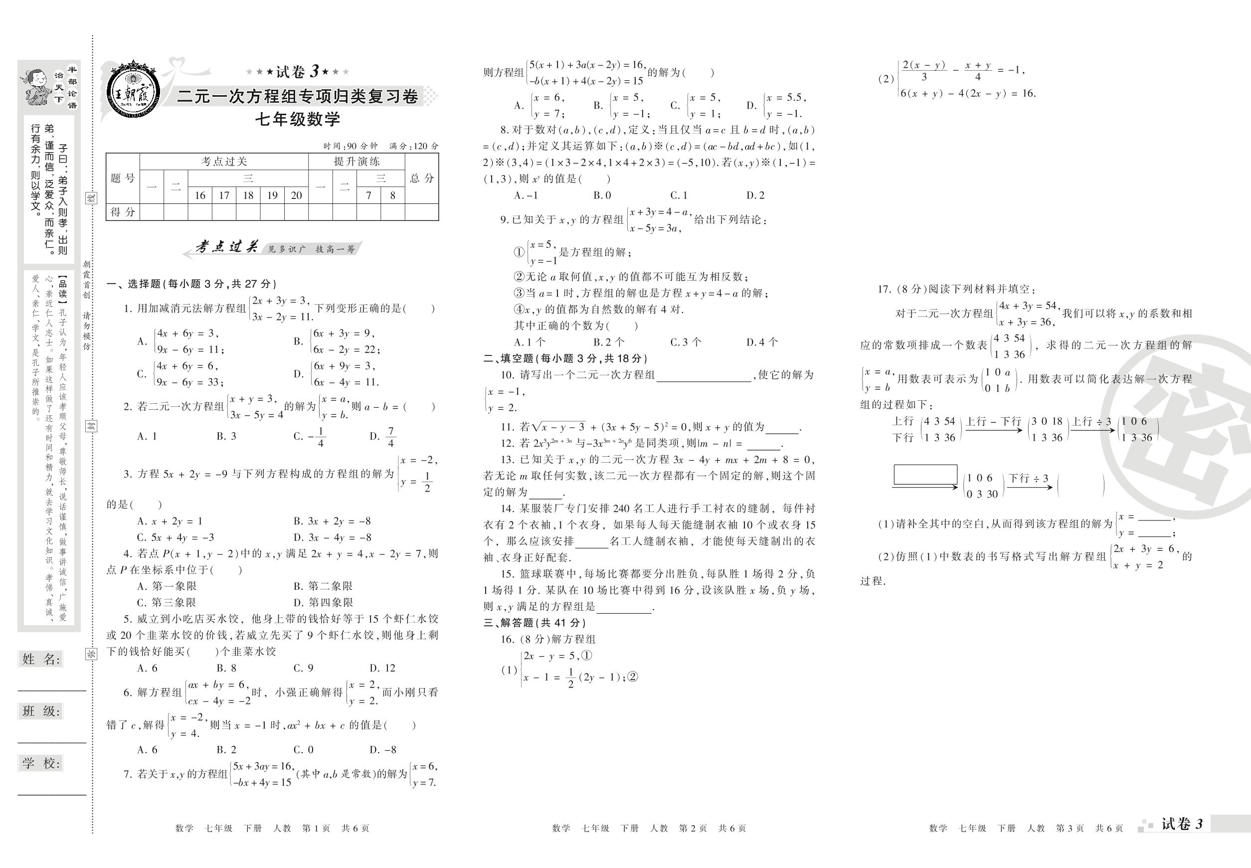 王朝霞期末专项卷——二元一次方程组专项归类复习卷七年级下册数学(人教版)【3】