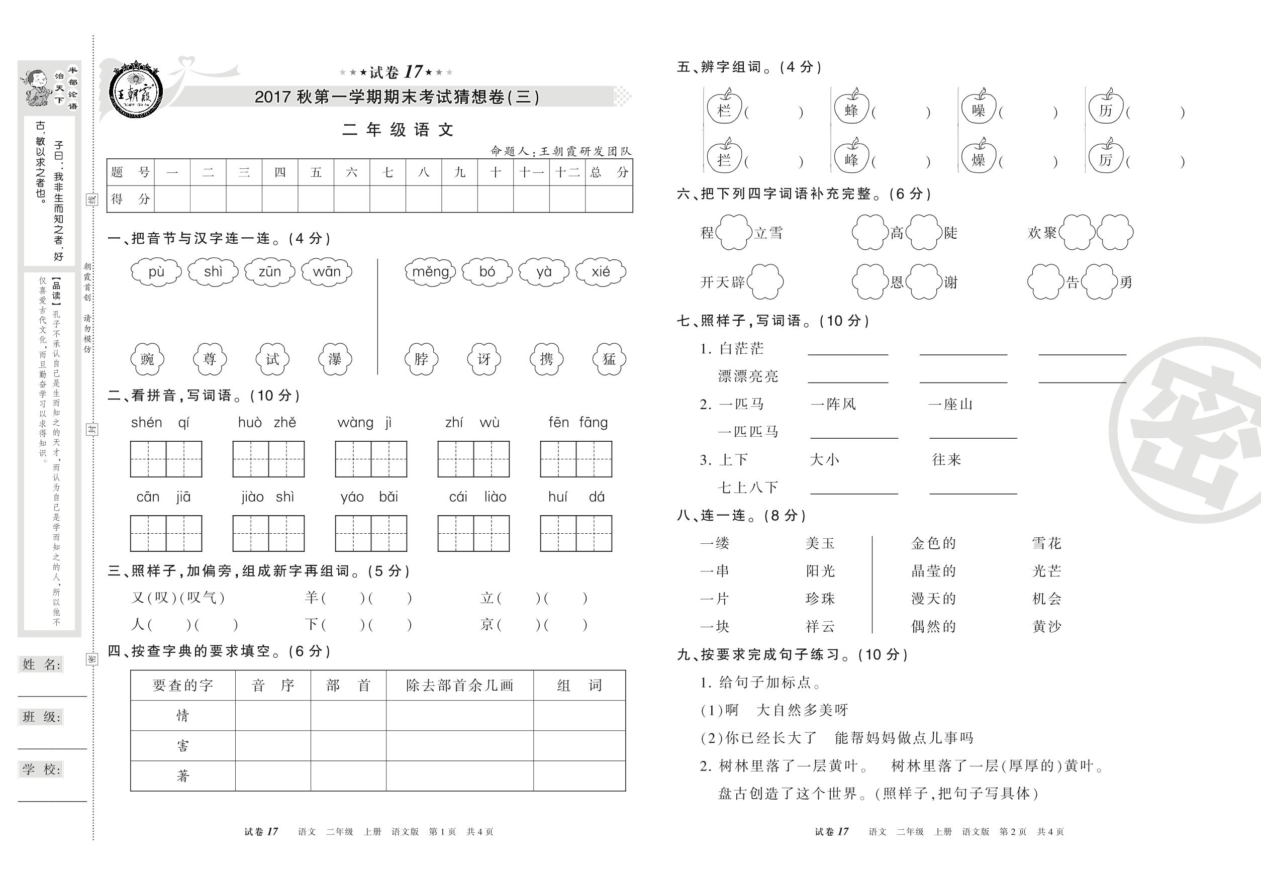 王朝霞期末猜想卷二年级上册语文(语文版)【17】
