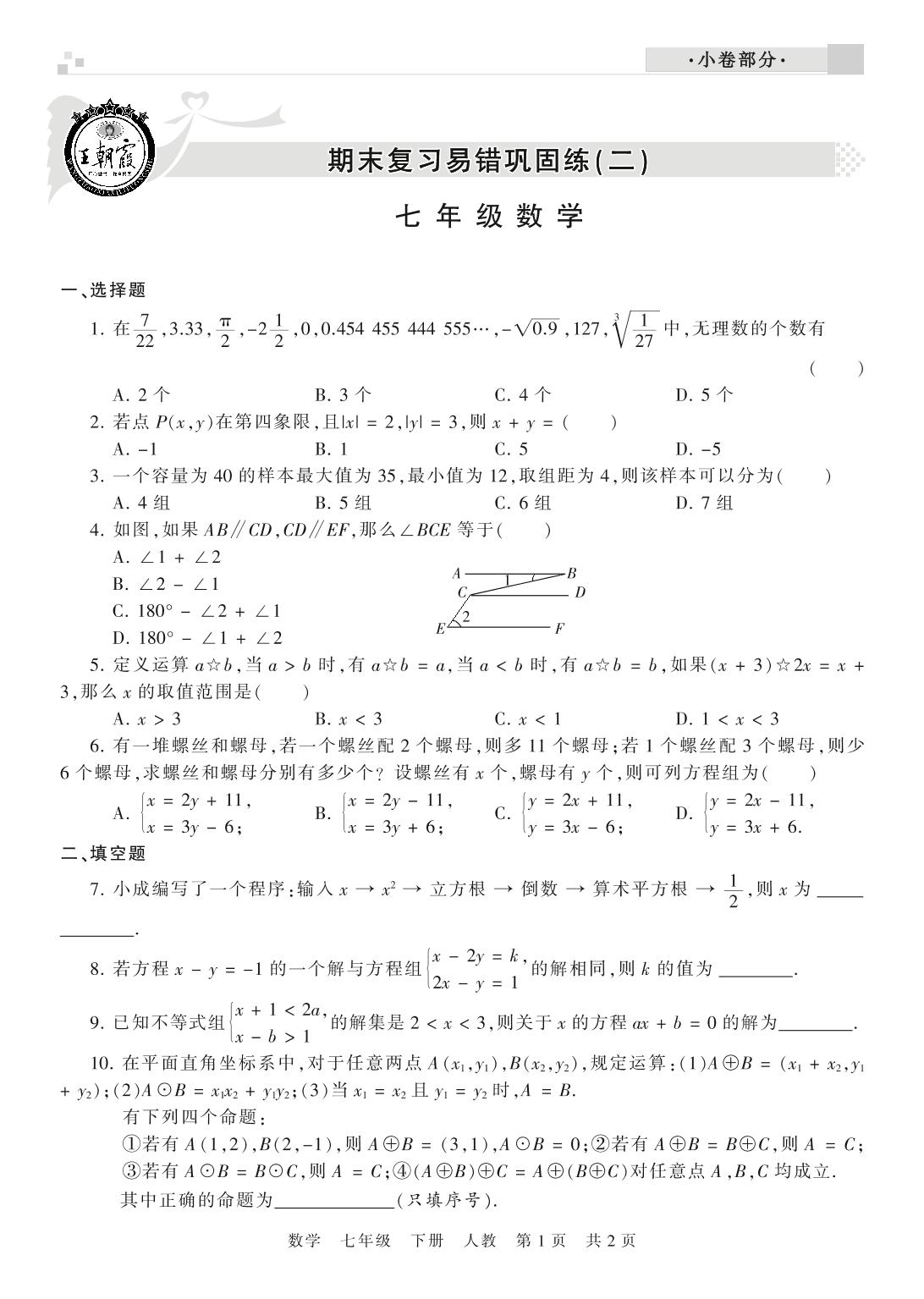 王朝霞期末小卷——期末复习易错巩固练(二)七年级下册数学(人教版)【0】