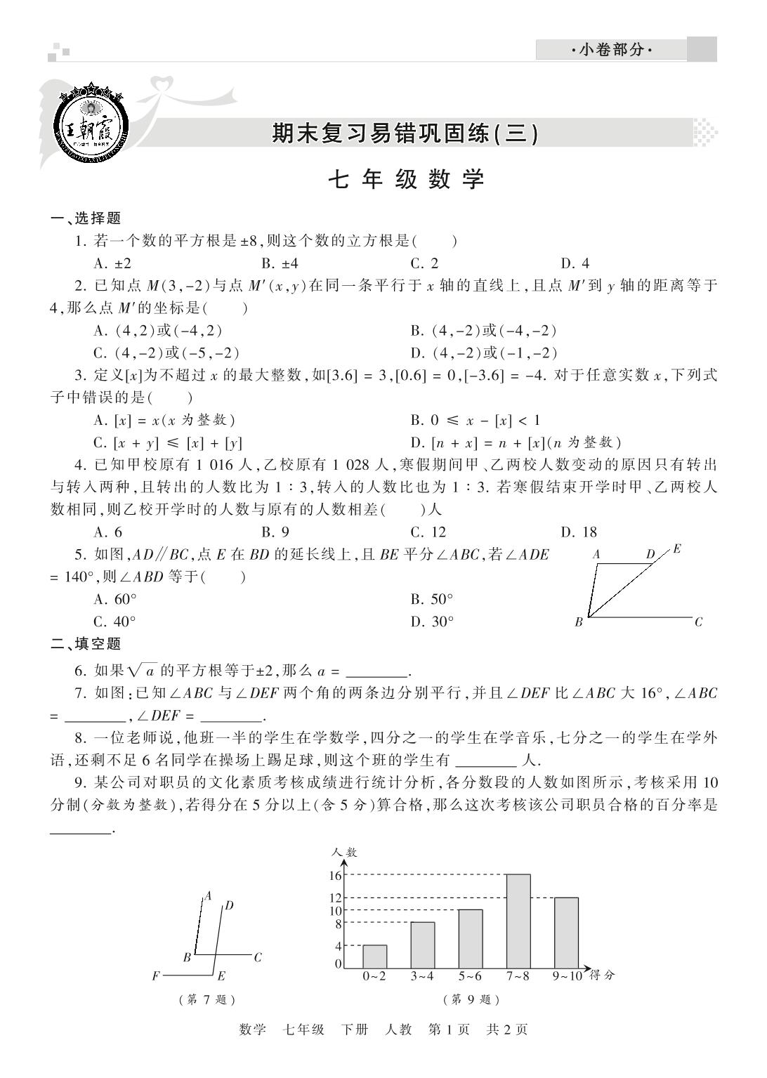 王朝霞期末小卷——期末复习易错巩固练(三)七年级下册数学(人教版)【0】