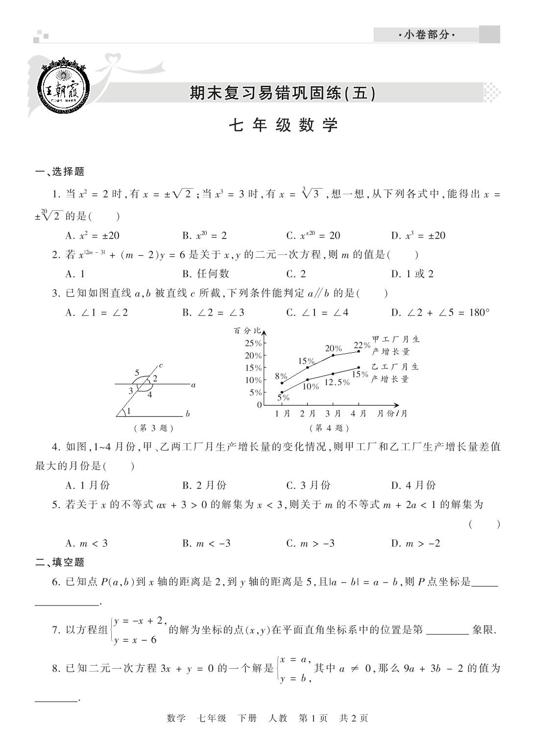 王朝霞期末小卷——期末复习易错巩固练(五)七年级下册数学(人教版)【0】