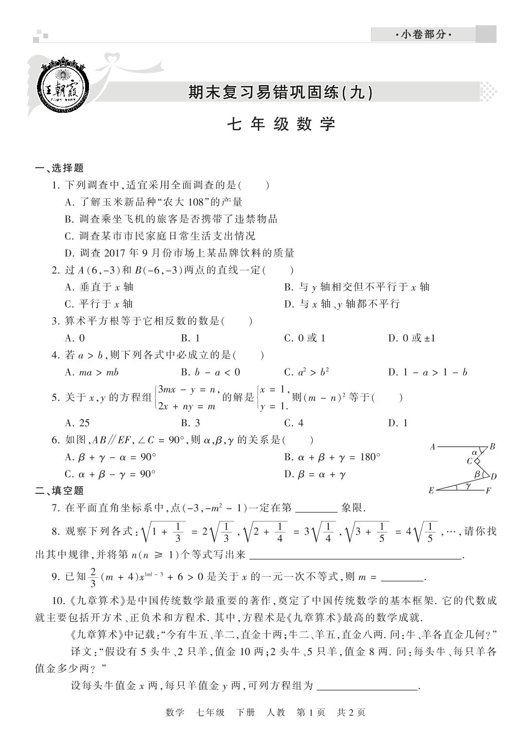 王朝霞期末小卷——期末复习易错巩固练(九)七年级下册数学(人教版)【0】