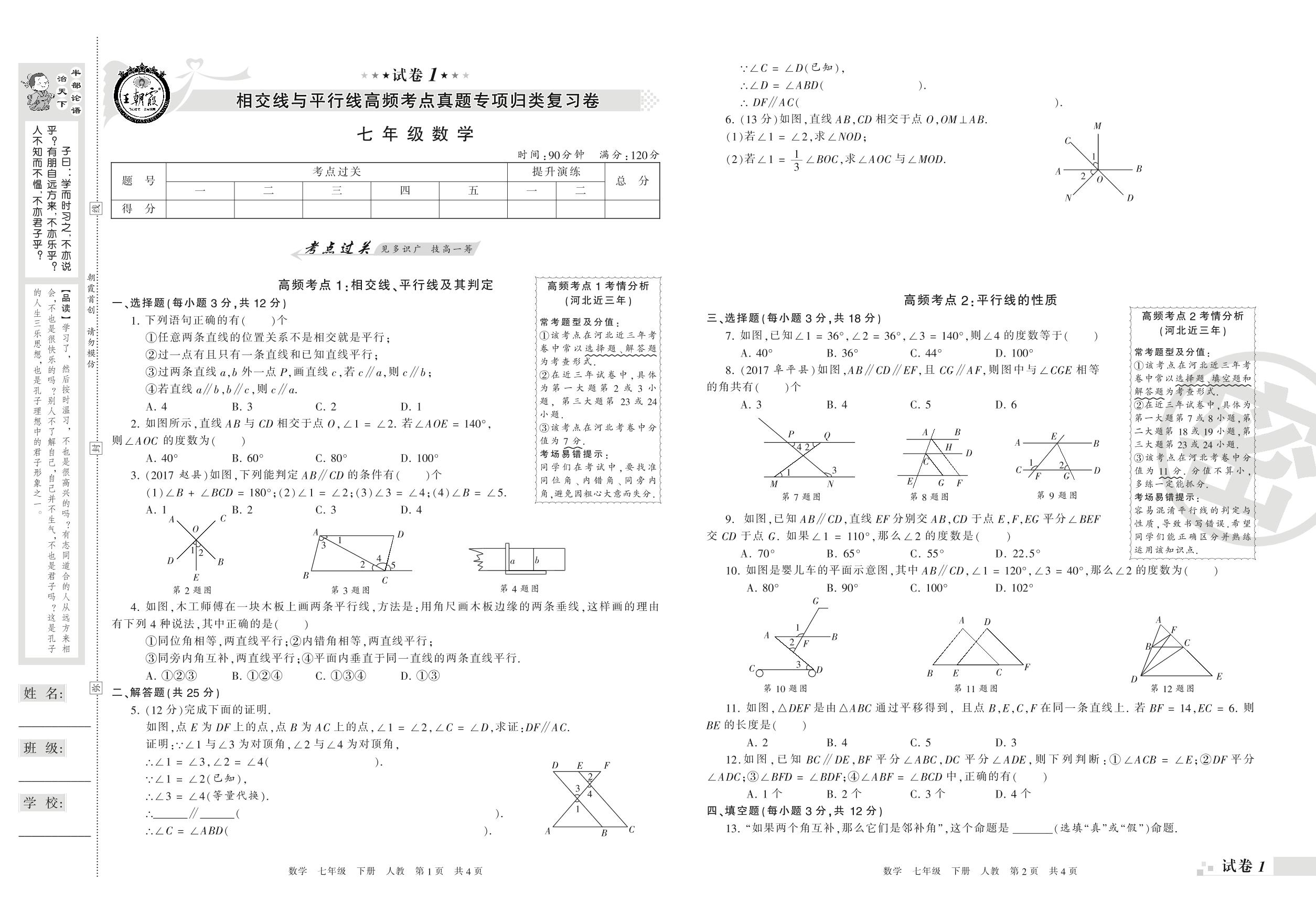 王朝霞期末专项卷——相交线与平行线高频考点真题专项归类复习卷七年级下册数学(人教版)【1】